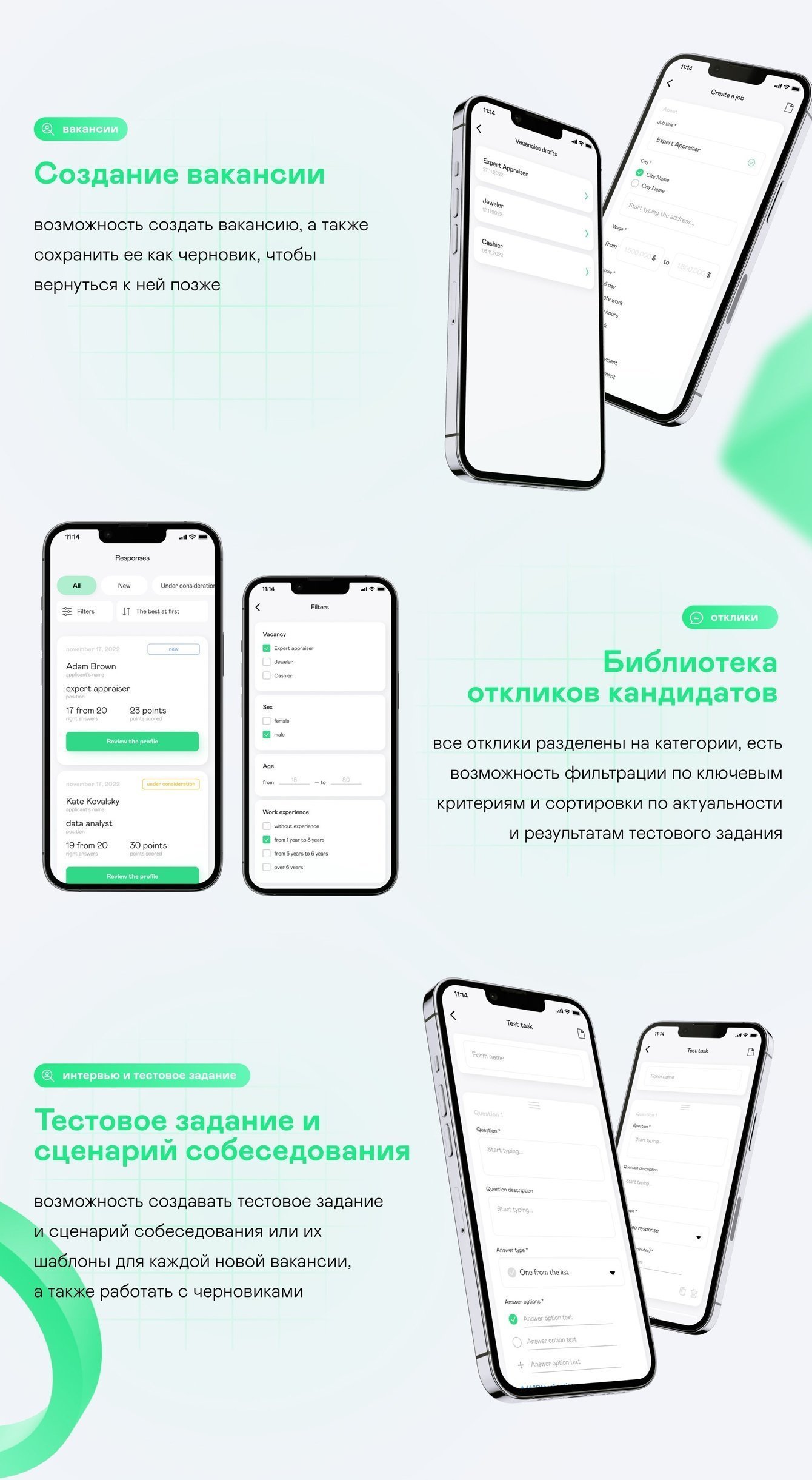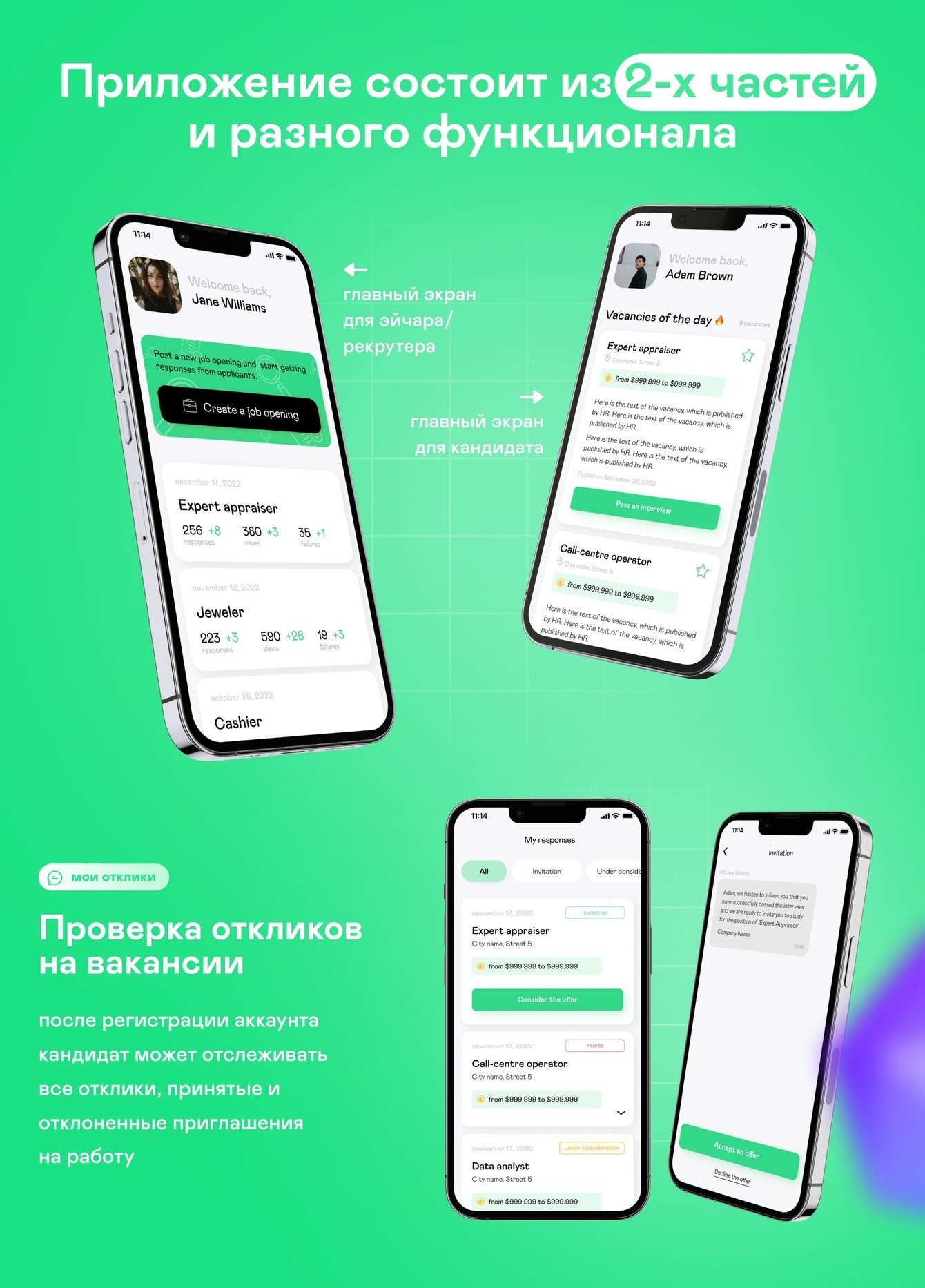 Мобильное приложение должно сократить затраты времени и ресурсов на найм сотрудников и поиск работы, сделать процесс на 100% прозрачным и простым, обеспечить качественную коммуникацию между работодателями и кандидатами.