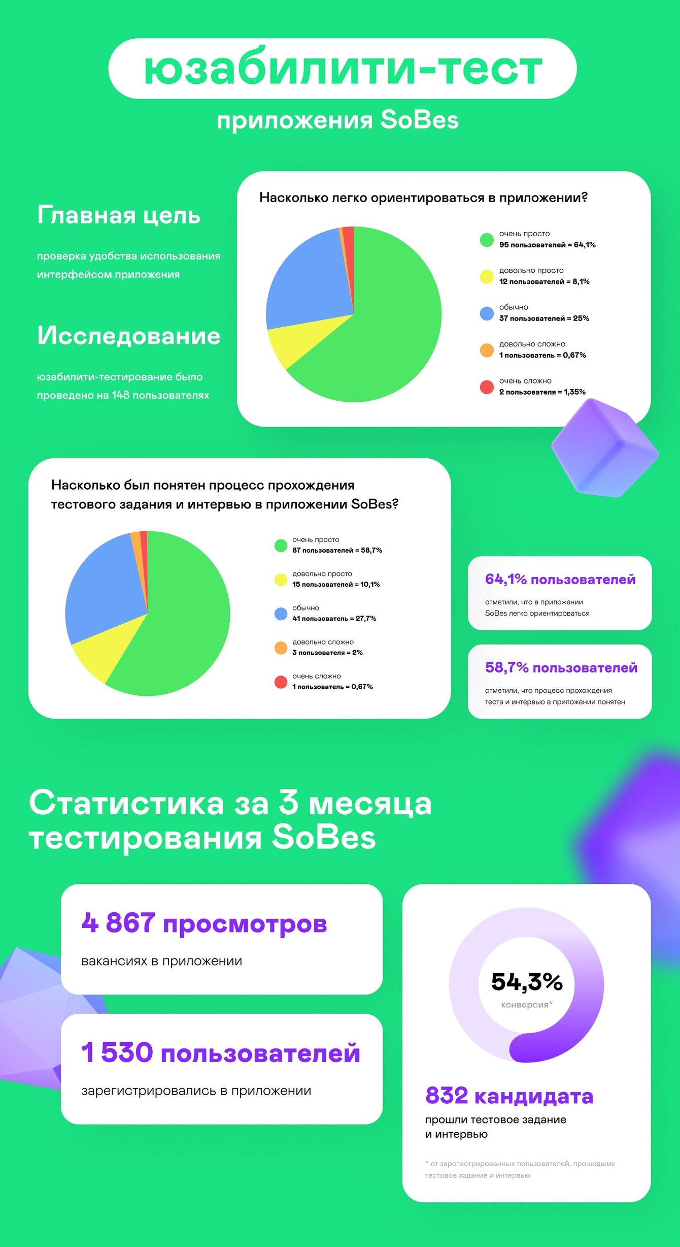 Статистика за первые три месяца: 4 867 просмотров вакансий, 1 530 зарегистрированных пользователей, 832 успешно выполненных тестов и пройденных интервью.