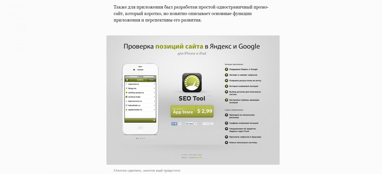 Также для приложения был разработан простой одностраничный промо-сайт, который коротко, но понятно описывает основные функции приложения и перспективы его развития.
