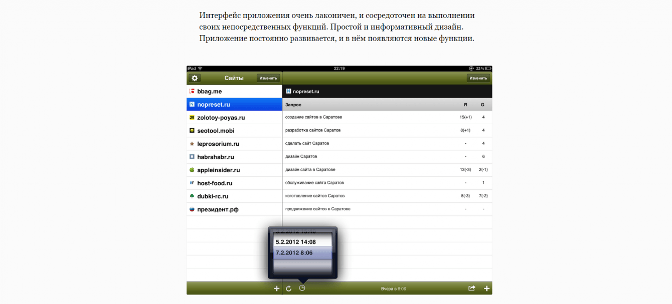Это приложение сделано для тех, у кого есть сайты, и кто хочет следить за позициями этих сайтов в поисковых системах Яндекс и Google.
