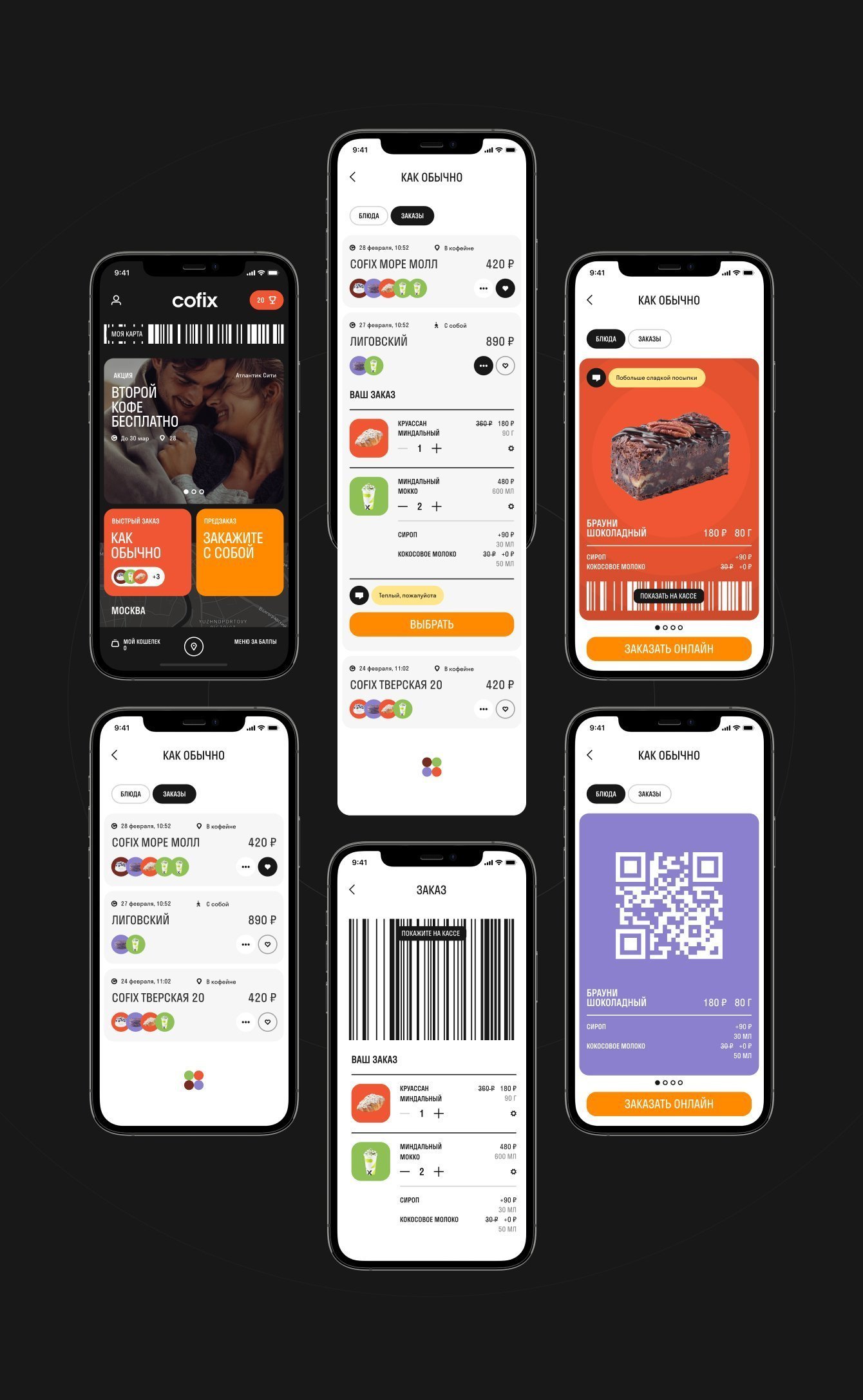 Чтобы вписать дизайн приложения в бренд-систему Cofix, следовал рекомендациям брендбука по использованию логотипа, графики, фотографий и принципов оформления баннеров. Использовали шрифт Stratos c характерными засечками, а также фирменную цветовую палитру бренда во главе с ярко-оранжевым цветом. Это позволило создать узнаваемое и ассоциирующееся с Cofix визуальное оформление, которое гармонично встраивается в имидж бренда кофеен.