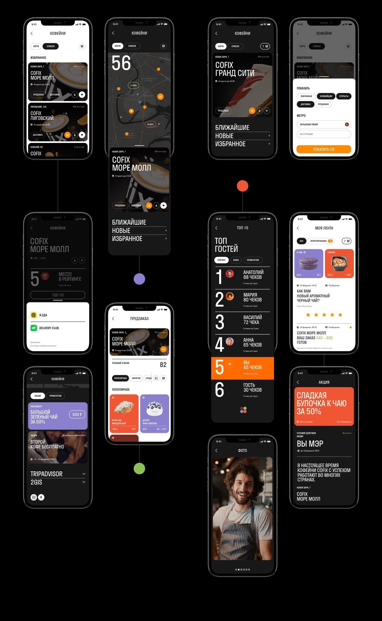 За визуализацию интерфейса отвечал Александр Лагута. При разработке дизайна он опирался на фирменный стиль Cofix и тенденции в мобильных приложениях: плоские формы, прямые линии, плавные переходы.