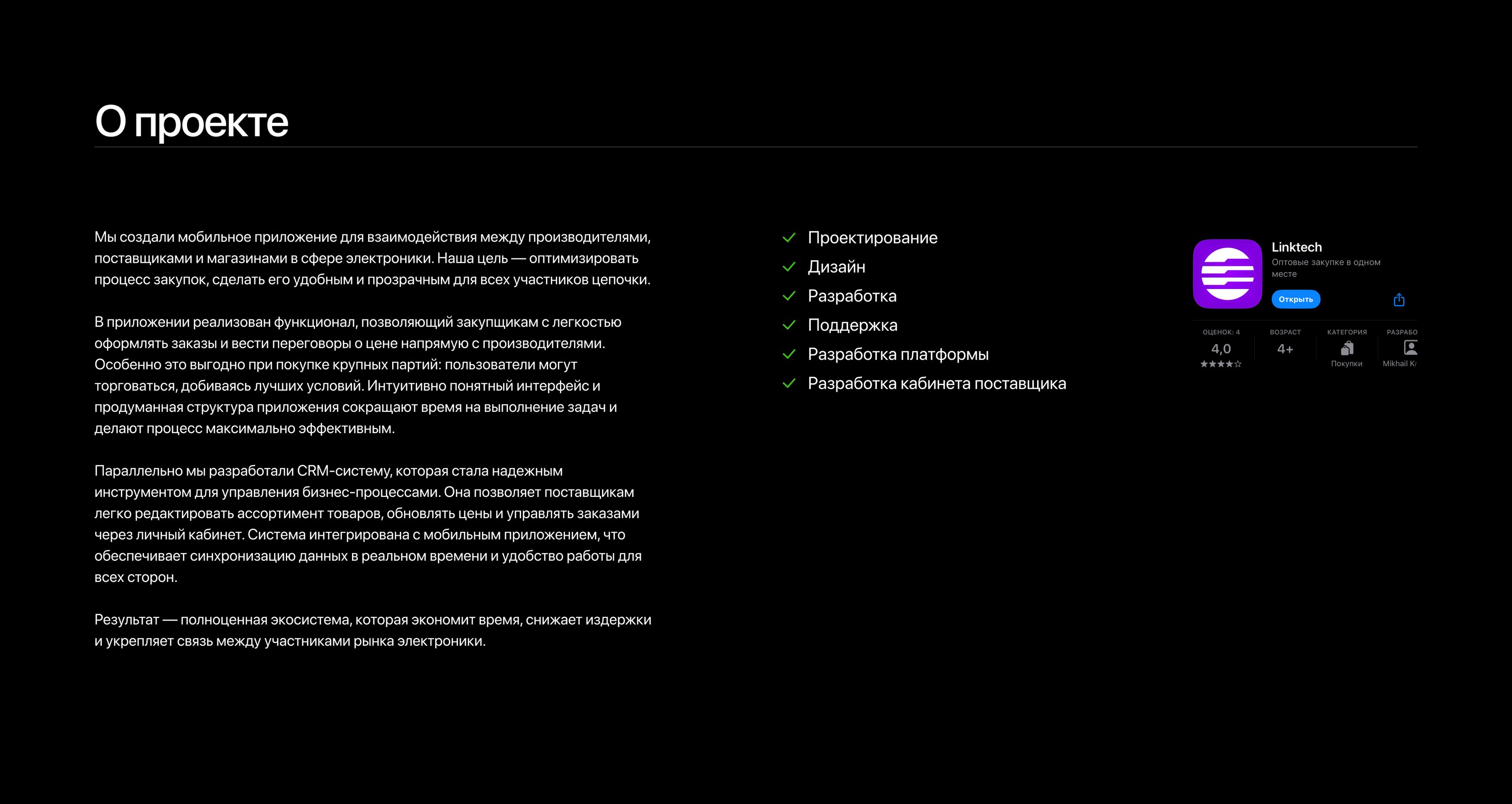 Мы разработали инновационное мобильное приложение LinkTech, которое соединяет ключевых игроков рынка электроники и делает закупки удобными и прозрачными.