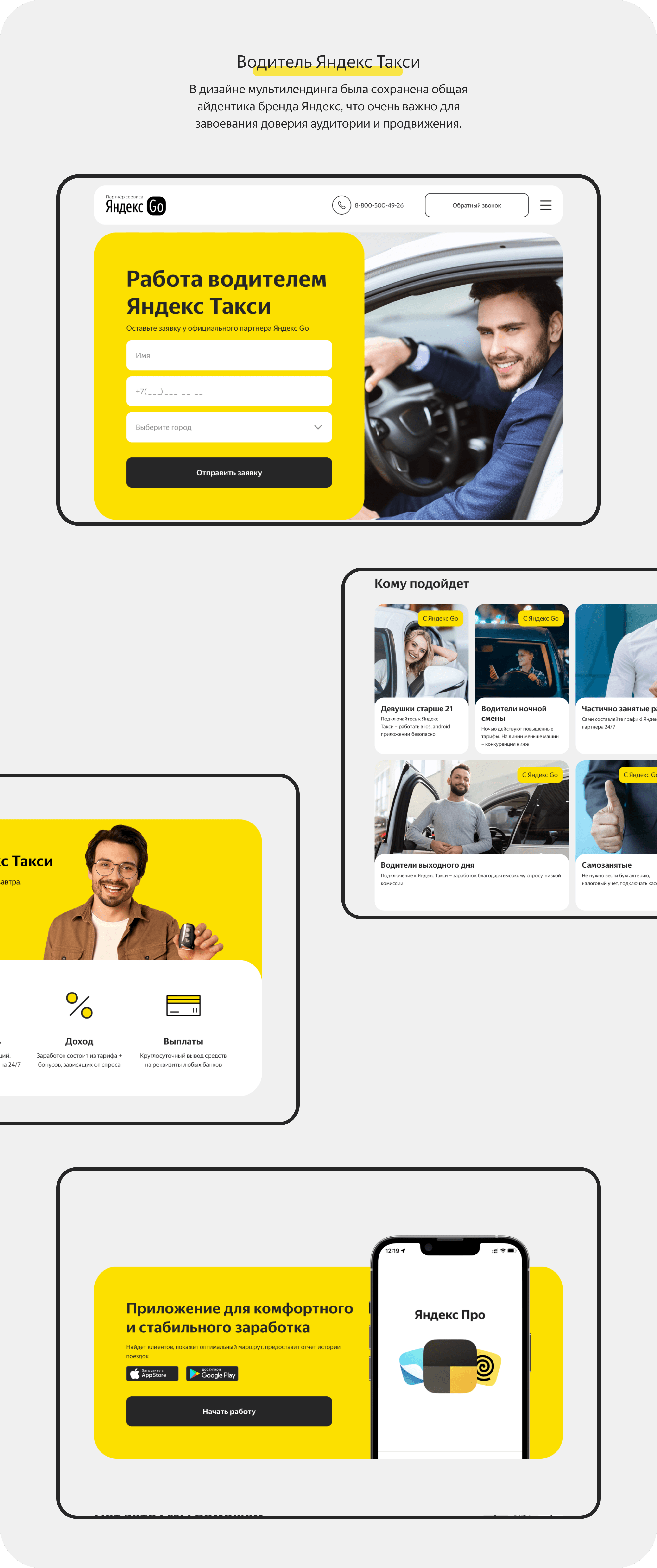 Мы разработали уникальную визуальную концепцию и отрисовали макеты и окна с учетом адаптивных версий (ПК, планшет, мобильные). Сохранение констант бренда Яндекс (шрифты, цветовая палитра) повысило доверие пользователей и укрепило УТП лендингов.