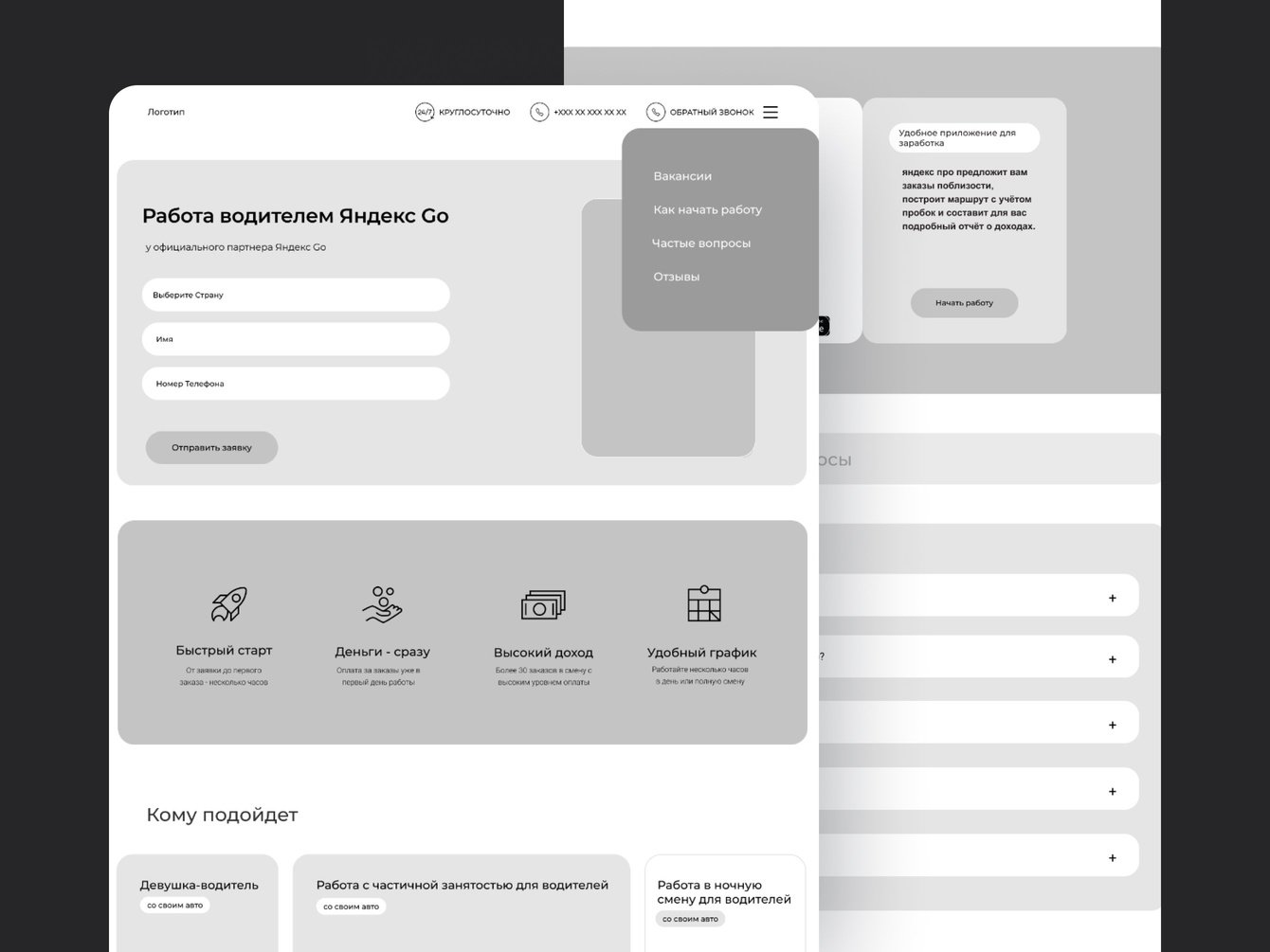 К нам обратился официальный партнер сервиса Яндекс с целью увеличить трафик для поиска сотрудников по трем направлениям: водитель Яндекс Go, курьер Яндекс Еда и водитель Яндекс Такси. Устаревшие лендинги не показывали результата и были непригодны для SEO-оптимизации.