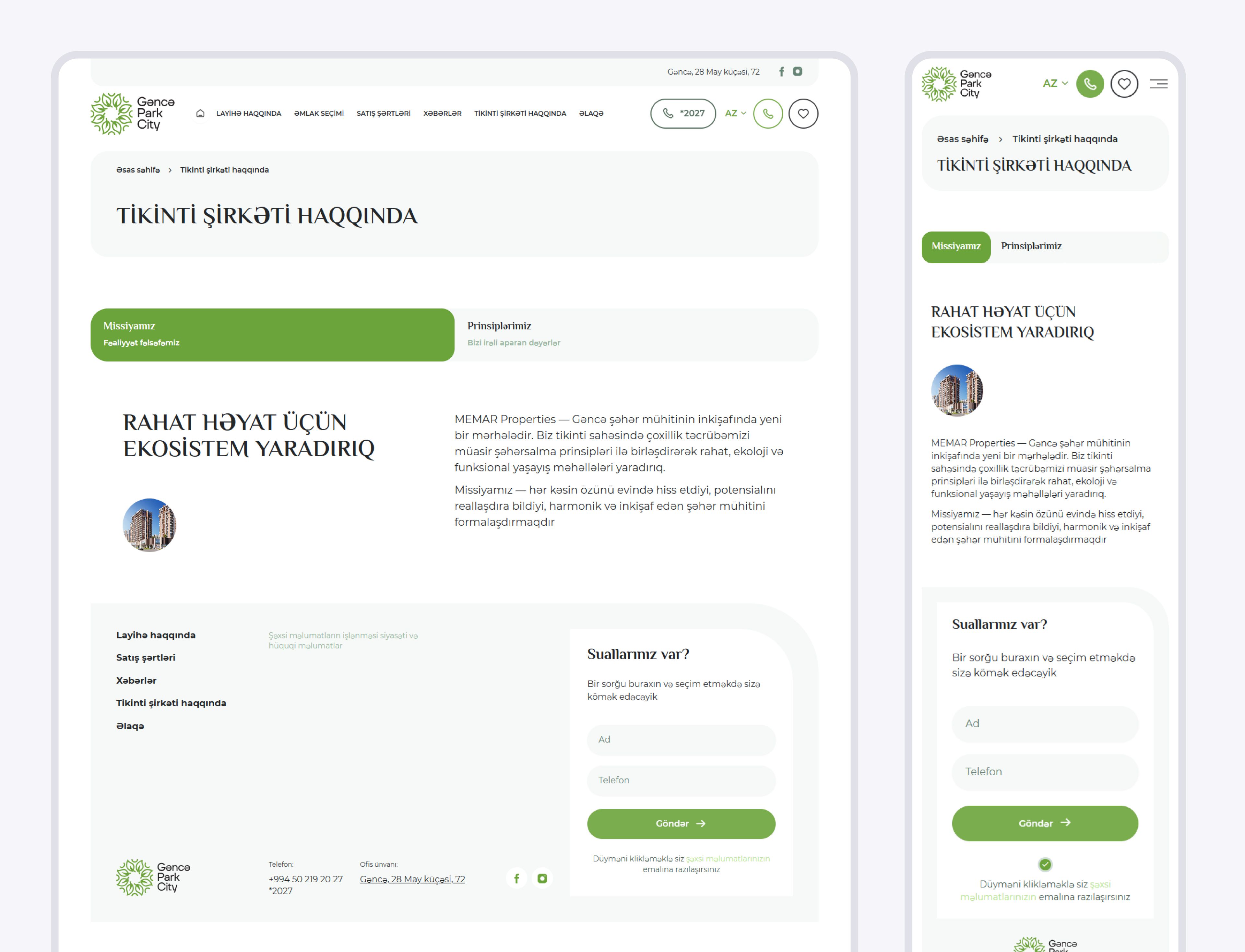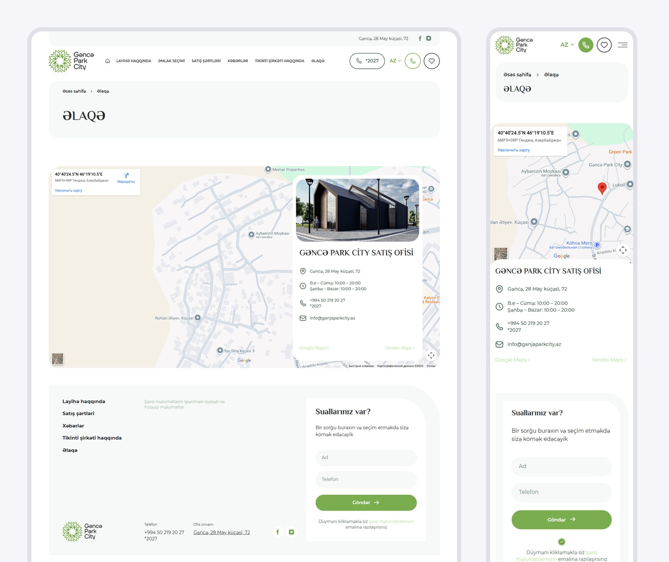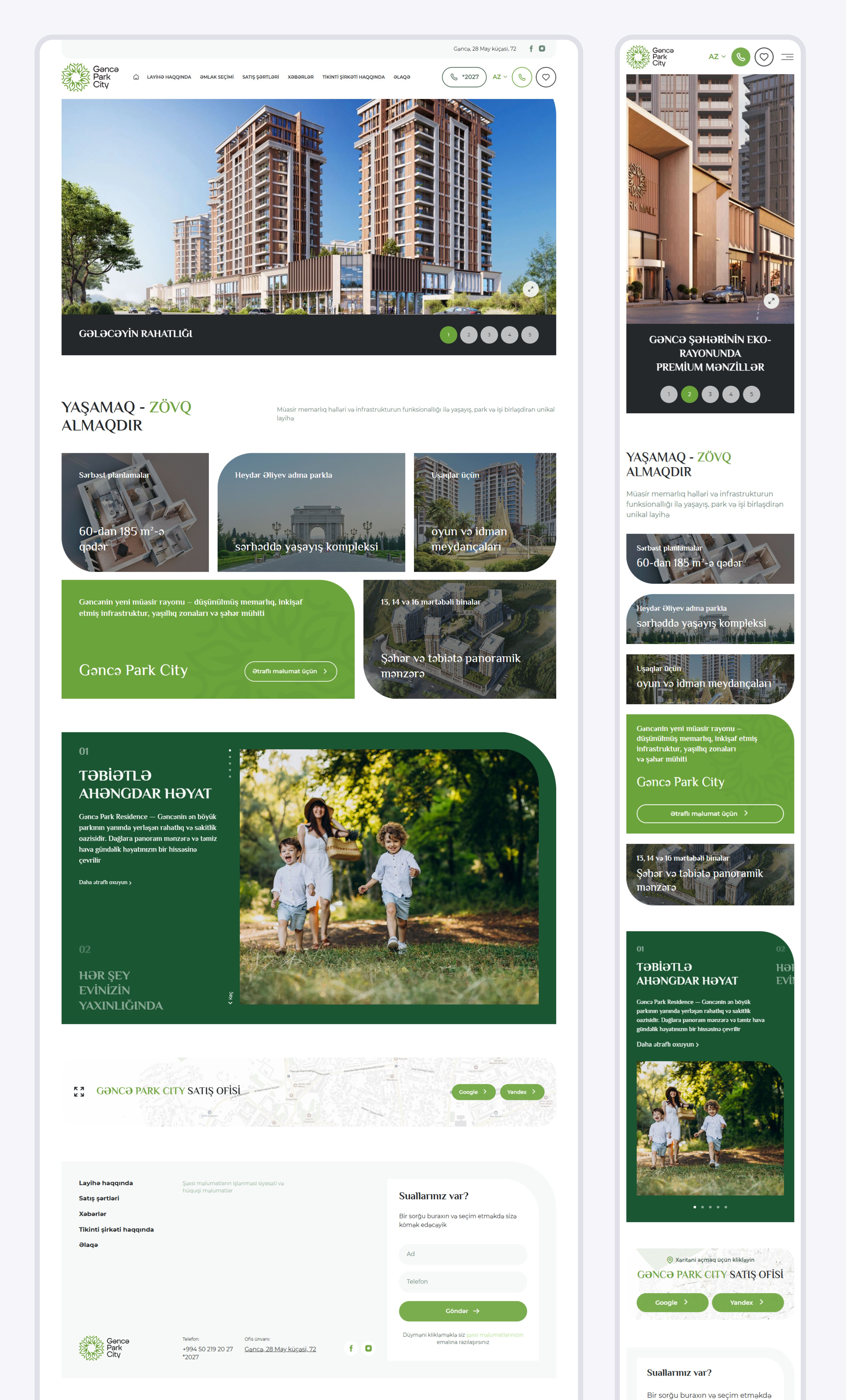 Клиенту поставил задачу разработать мультиязычный корпоративный сайт девелопера с поддержкой азербайджанского и русского языков. Важно было обеспечить корректную адаптацию контента и функционала для каждой языковой версии, реализовать удобное переключение между ними и выдержать дизайн в рамках бренд-концепции. Отдельное требование — создать масштабируемую структуру, которая в будущем позволит трансформировать сайт в корпоративную платформу застройщика с возможностью добавления новых проектов и объектов недвижимости.