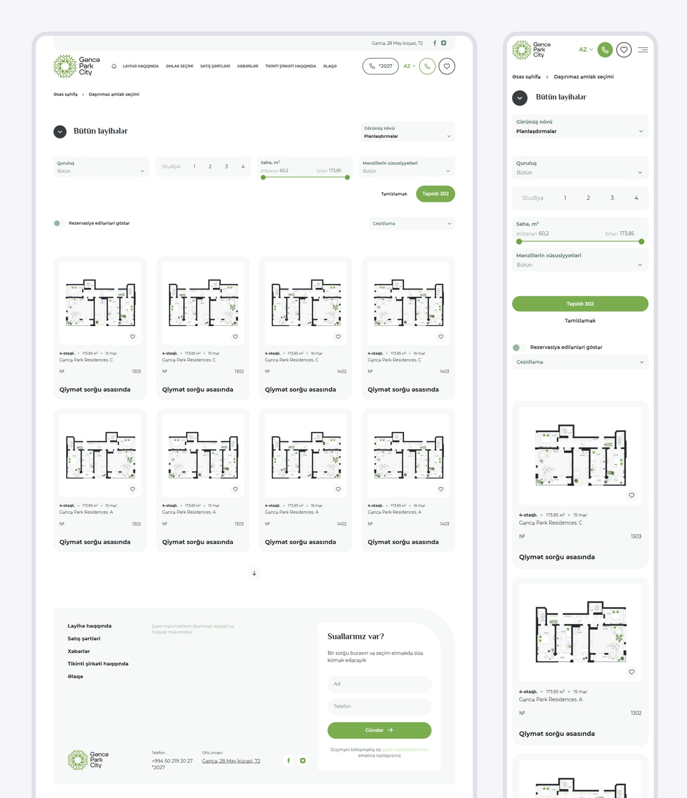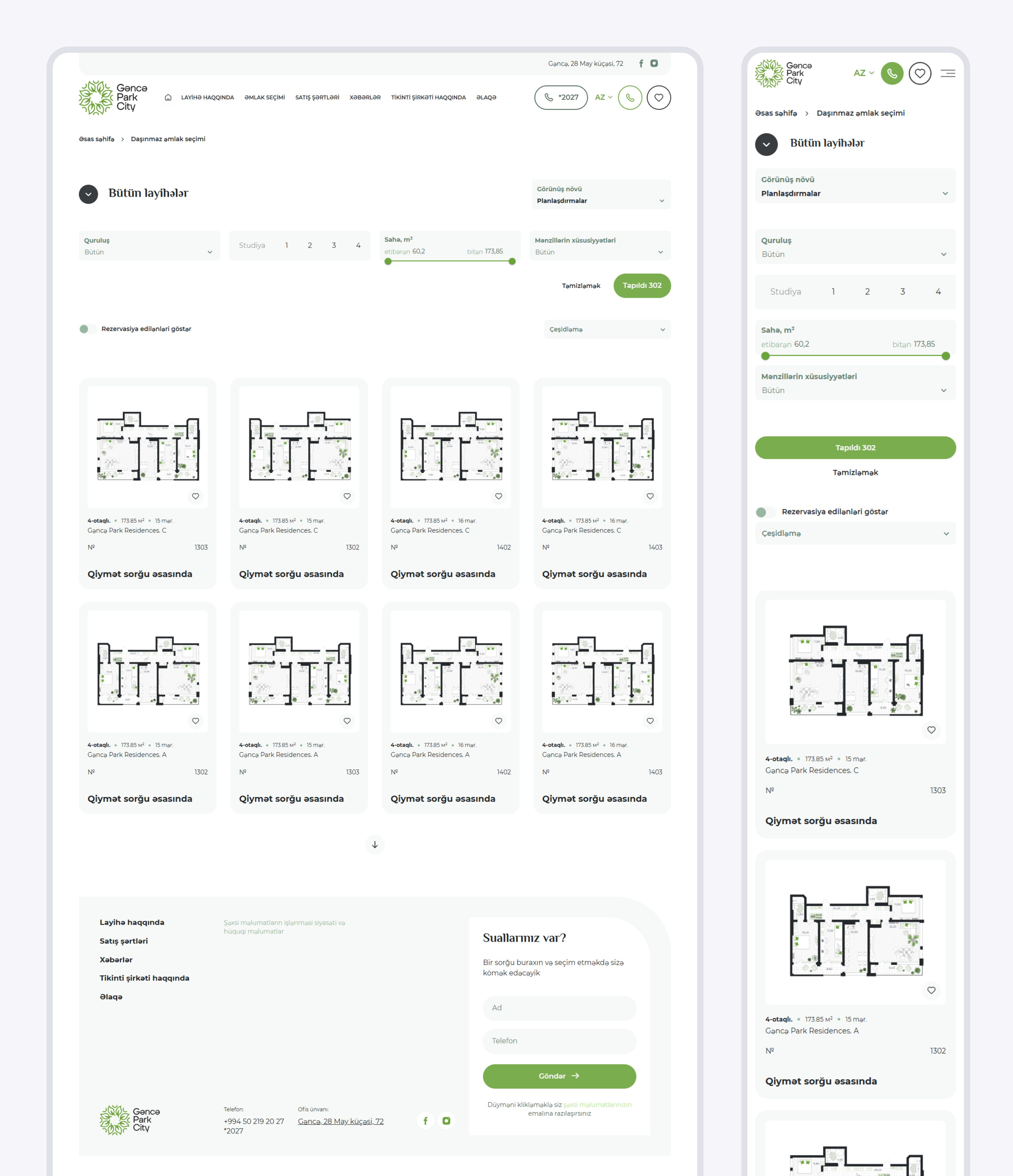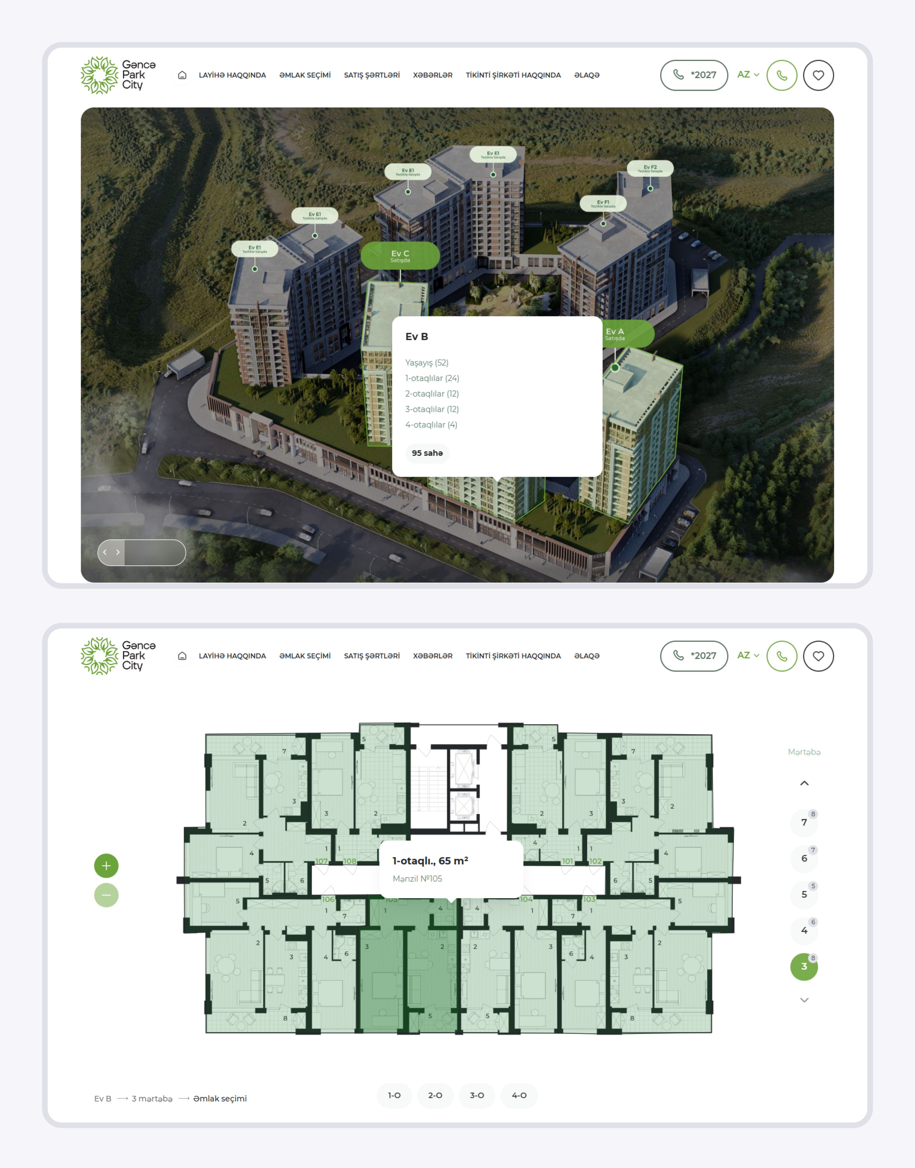 Наша разработка — плагин недвижимости — полностью адаптирован как под азербайджанский, так и под русский языки. Сайт спроектирован с заделом на будущее: в верхнем выпадающем меню можно выбрать интересующий проект. Подбор квартиры осуществляется с помощью стандартных фильтров: корпус, количество комнат, площадь и теги. Также в административной панели есть возможность добавить дополнительные фильтры по секции и этажу.
