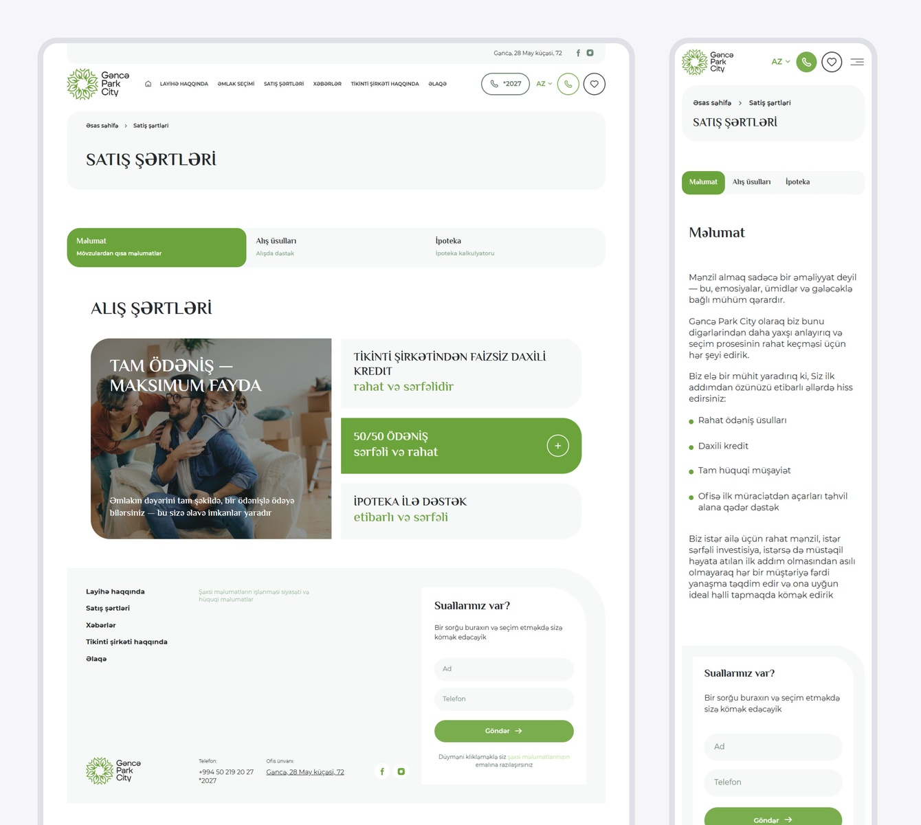 В этом разделе покупатели могут найти полезную информацию об условиях и способах покупки, а также о доступных консультациях. Блок выполнен в формате вкладок, что обеспечивает удобное и быстрое переключение между разделами. Вся информация также адаптирована по азербайджанский и русский языки.