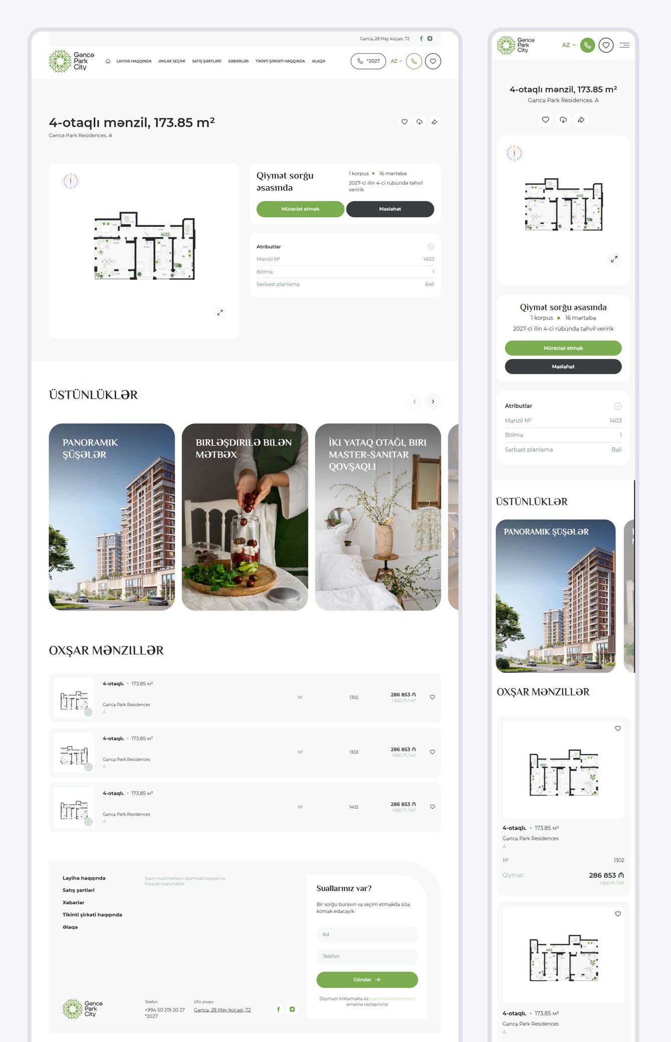 Детальная страница полностью адаптирована как для азербайджанского, так и для русского языков. На странице представлена подробная информация о квартире: планировка, характеристики и иллюстрированные преимущества. Блок "Похожие квартиры" помогает выбрать аналогичные квартиры по площади на другом этаже или в другом доме. Формы для бронирования и консультаций отправляют заявки в CRM-систему в реальном времени, обеспечивая быструю коммуникацию отдела продаж с покупателем.
