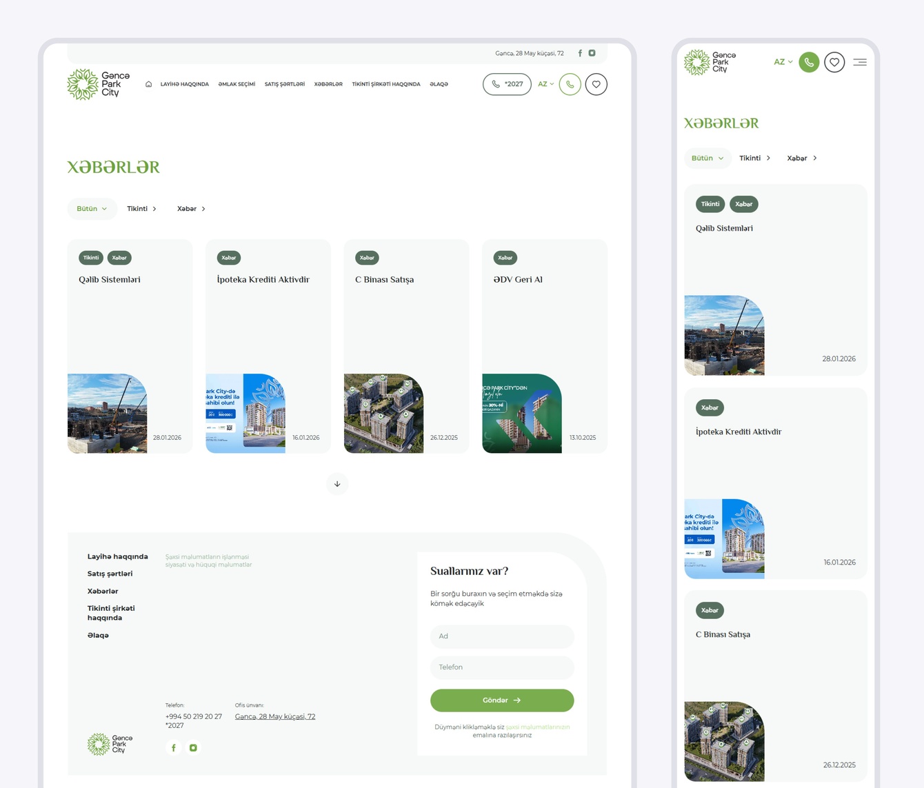 На странице представлены новости, акции и события застройщика с возможностью фильтрации по категориям. Дизайн карточек гармонично сочетается с общей стилистикой сайта. При клике на карточку открывается всплывающее окно с подробной информацией. Вся информация, включая карточки и модальные окна, имеет версию азербайджанского и русского языков.