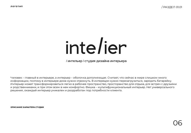 Задача – разработать минималистичный, узнаваемый и легко масштабируемый фирменный стиль для студии дизайна Интельер.