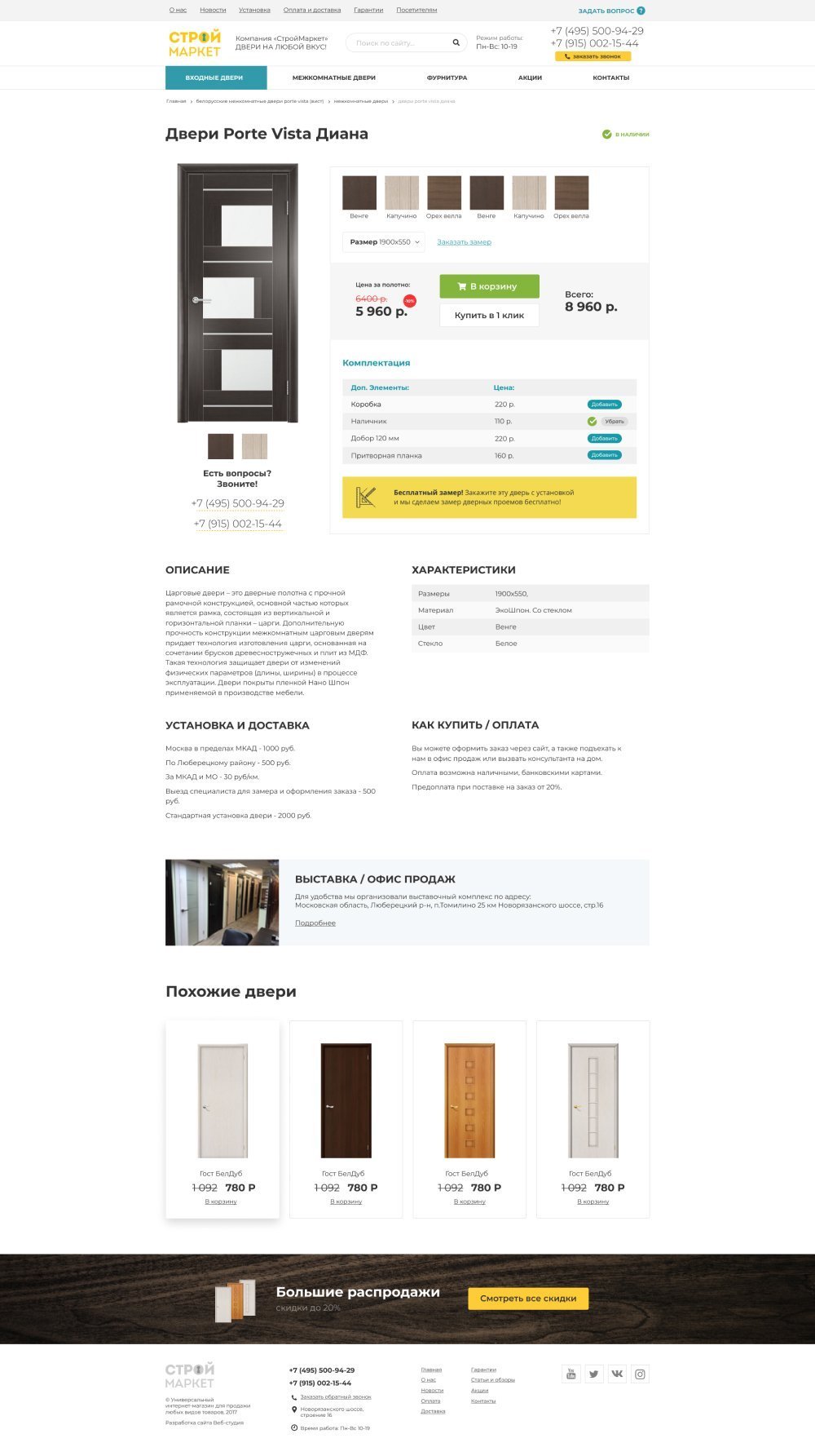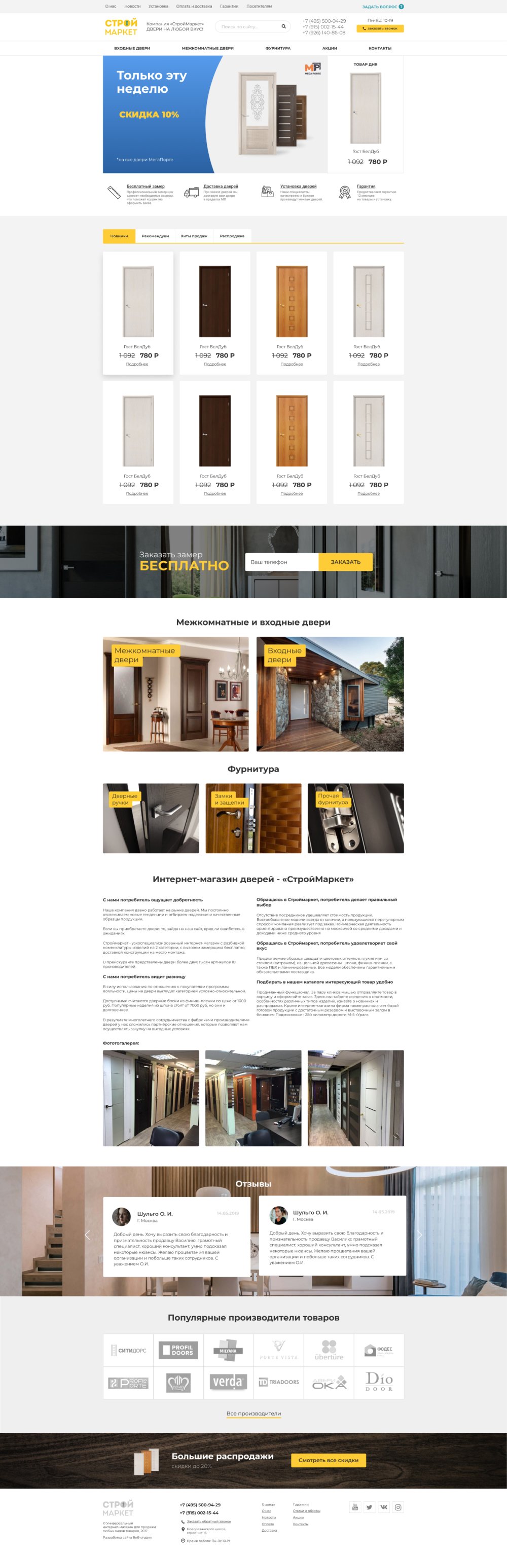 Создать полноценный интернет-магазин дверей и напольных покрытий для компании "СтройМаркет". Особенность площадки - большой ассортимент дверей с вариацией размеров, цветов, комплектации, фурнитуры и подсчета стоимости комплекта в зависимости от выбранных позиций.