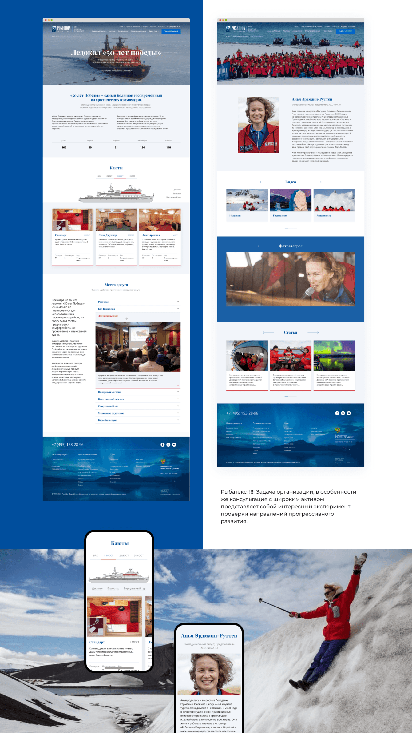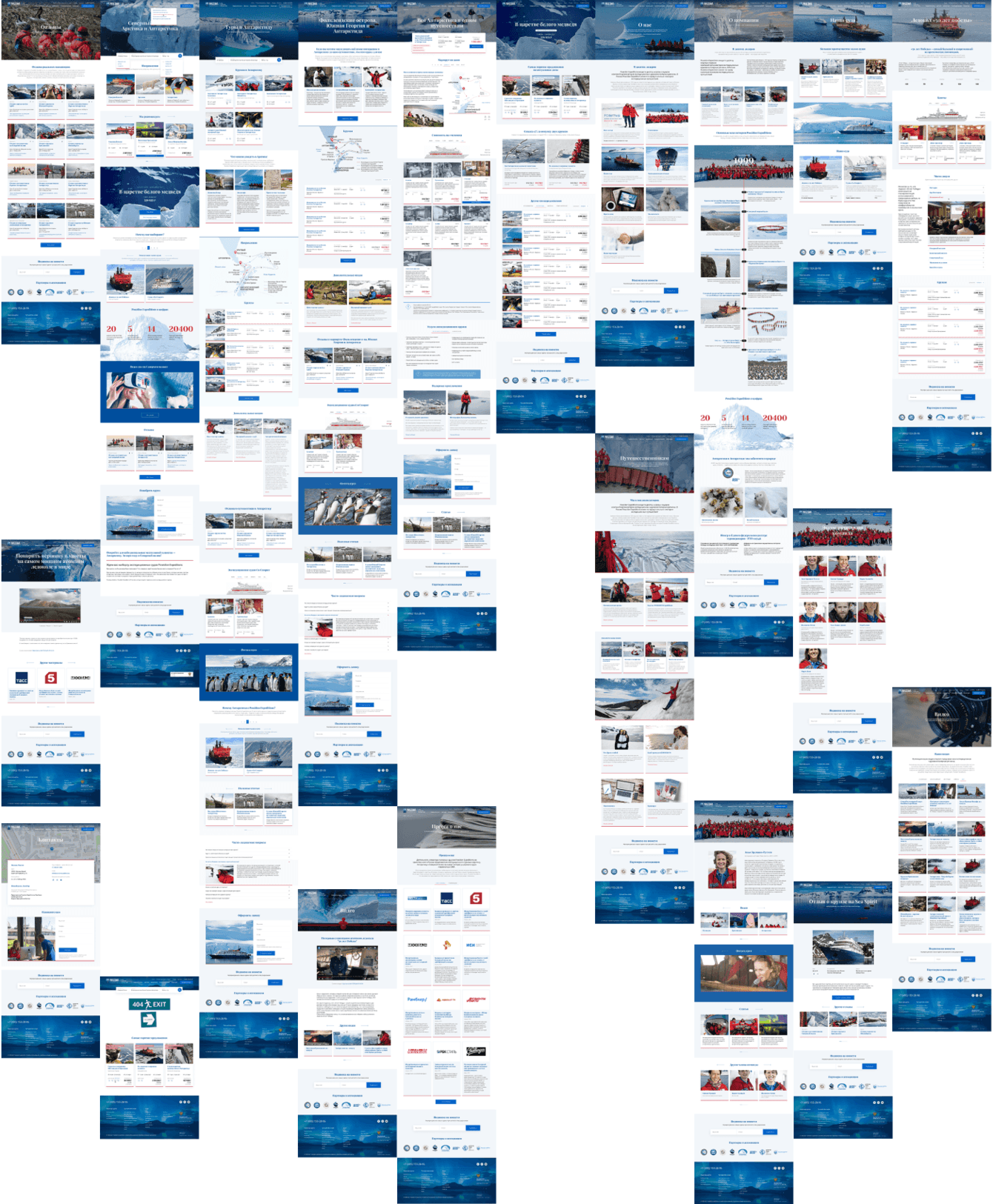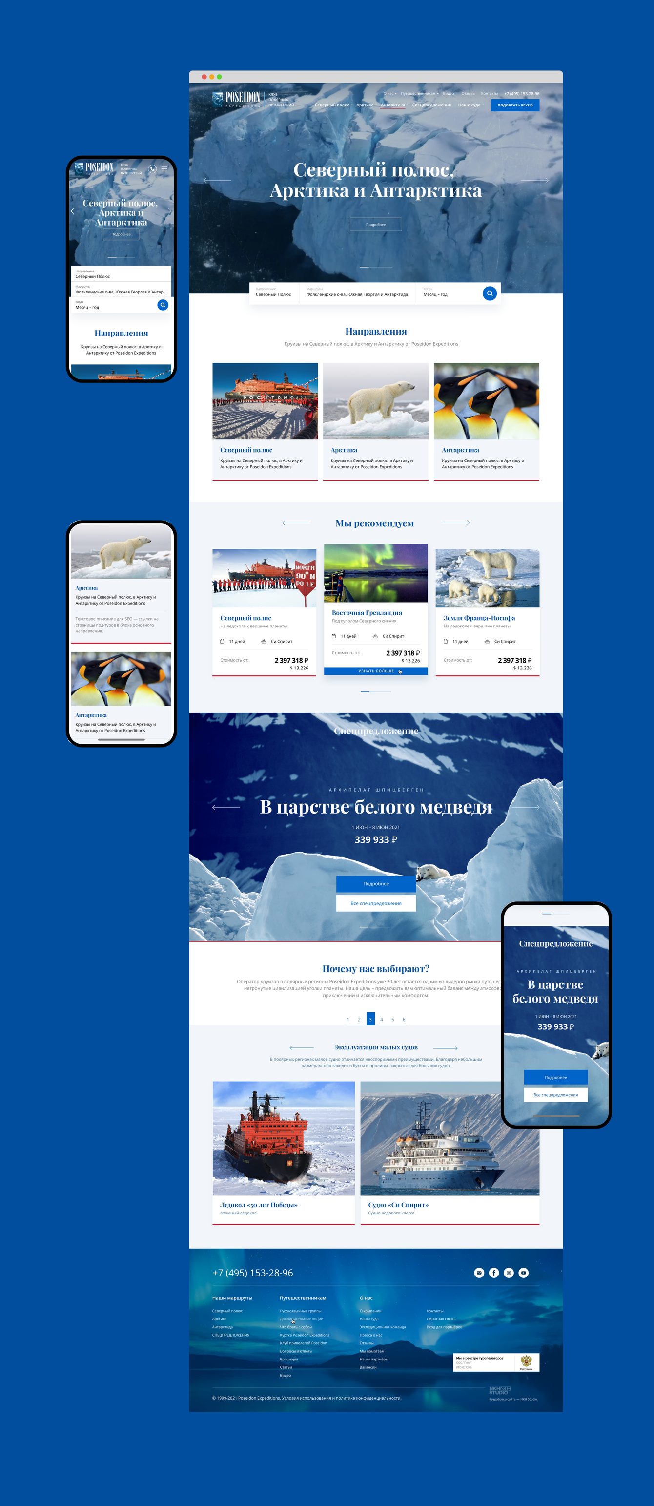 Главная страница с первых секунд показывает посетителю сайта что он попал на сайт оператора круизов в полярные регионы. На ней как на витрине собрано все самое необходимое: возможность быстро отфильтровать круизы и подобрать необходимый, рекомендации по направлениям, спецпредложения, видеотур и отзывы.