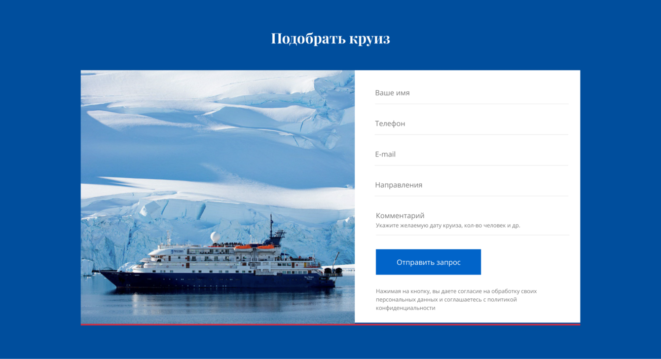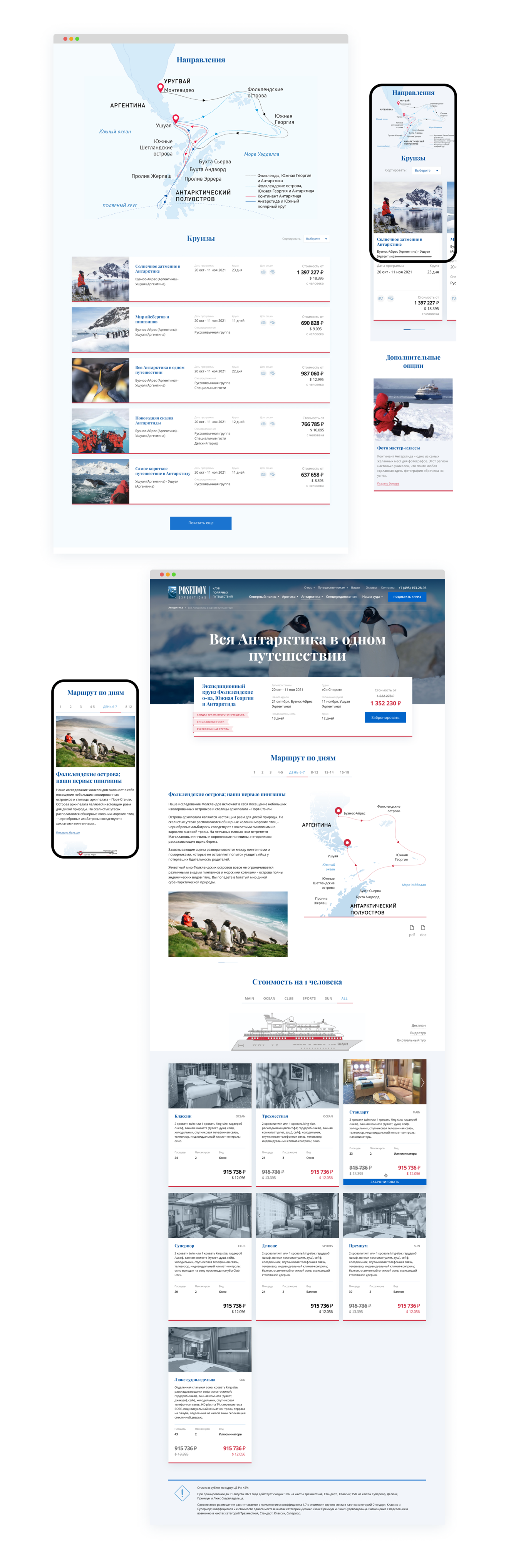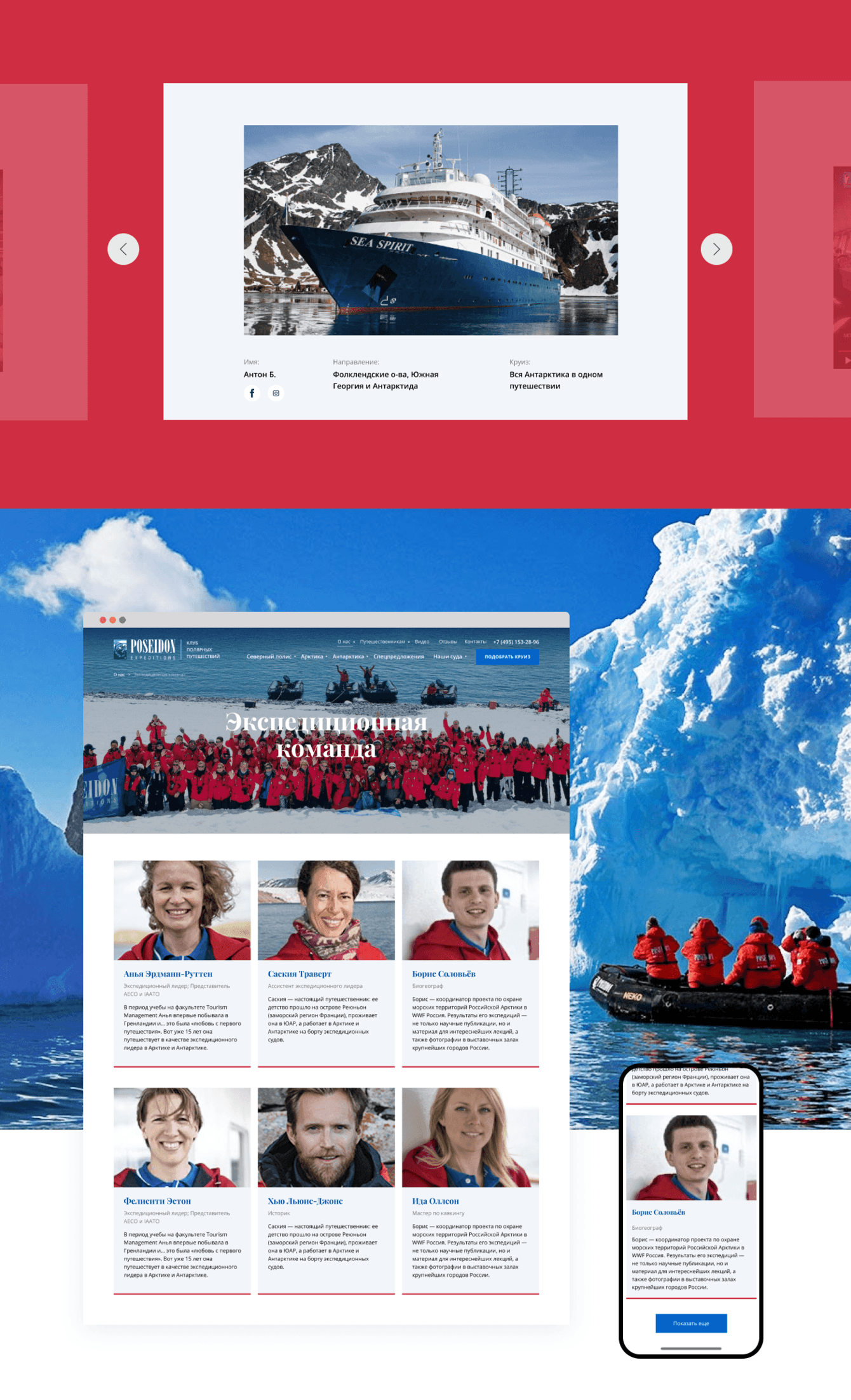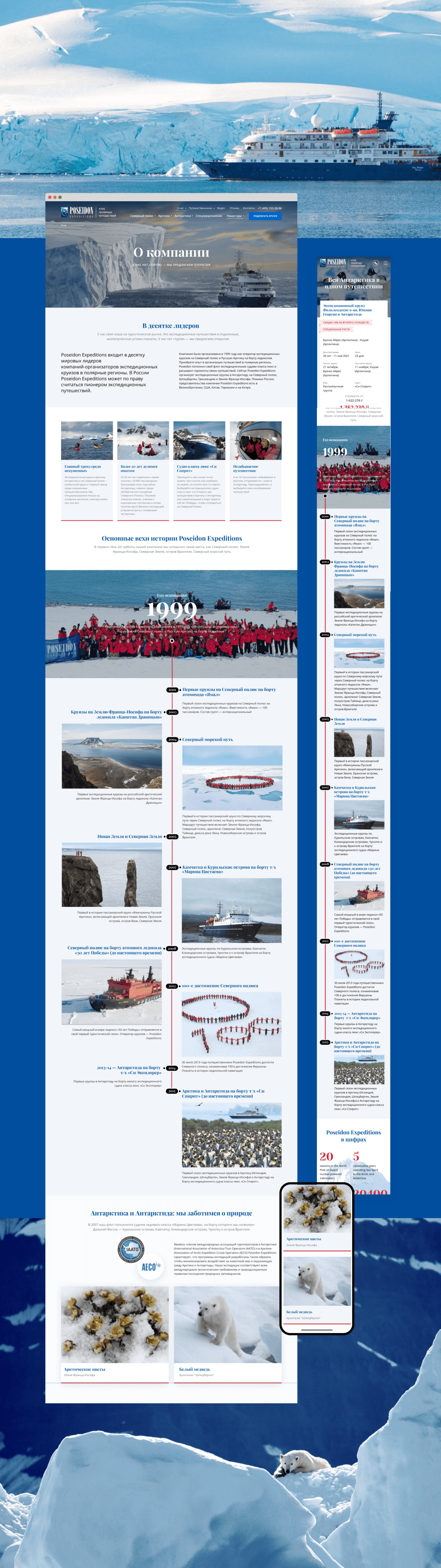 Главная страница с первых секунд показывает посетителю сайта что он попал на сайт оператора круизов в полярные регионы. На ней как на витрине собрано все самое необходимое: возможность быстро отфильтровать круизы и подобрать необходимый, рекомендации по направлениям, спецпредложения, видеотур и отзывы.
