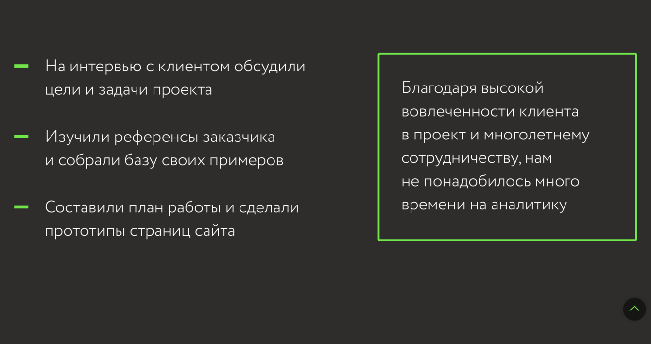 Благодаря высокой вовлеченности клиента в проект и многолетнему сотрудничеству, нам не понадобилось много времени на аналитику.