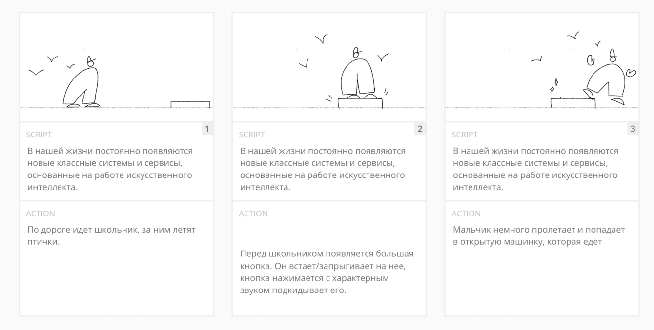 Мы задумали простых персонажей, поэтому раскадровка не заняла много времени. В ней мы подготовили общие композиции и добавили описание, чтобы все участники и мейкеры проекта двигались в едином информационном поле и не теряли из фокуса главную задачу.