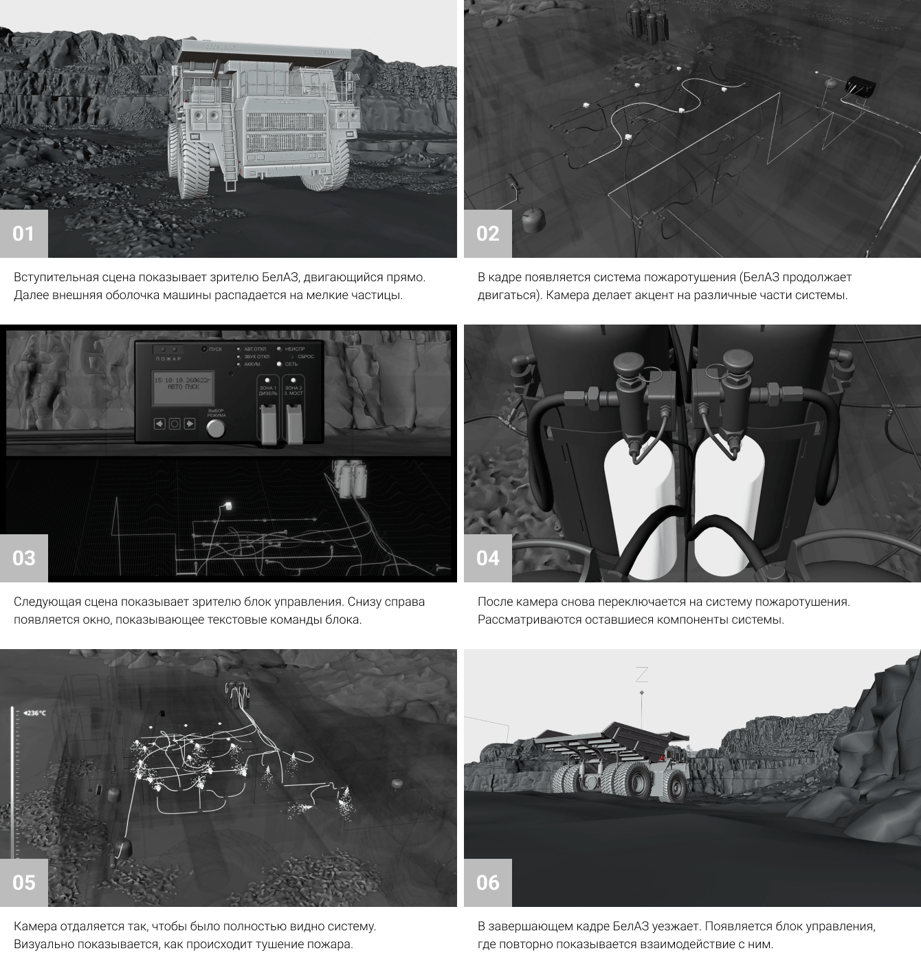 БелАЗ играл не менее ключевую роль в демонстрации системы пожаротушения. Мы стремились к максимальной реалистичности и наглядности данной модели, поэтому провели масштабную работу над проработкой текстурных ассетов и анимации.
