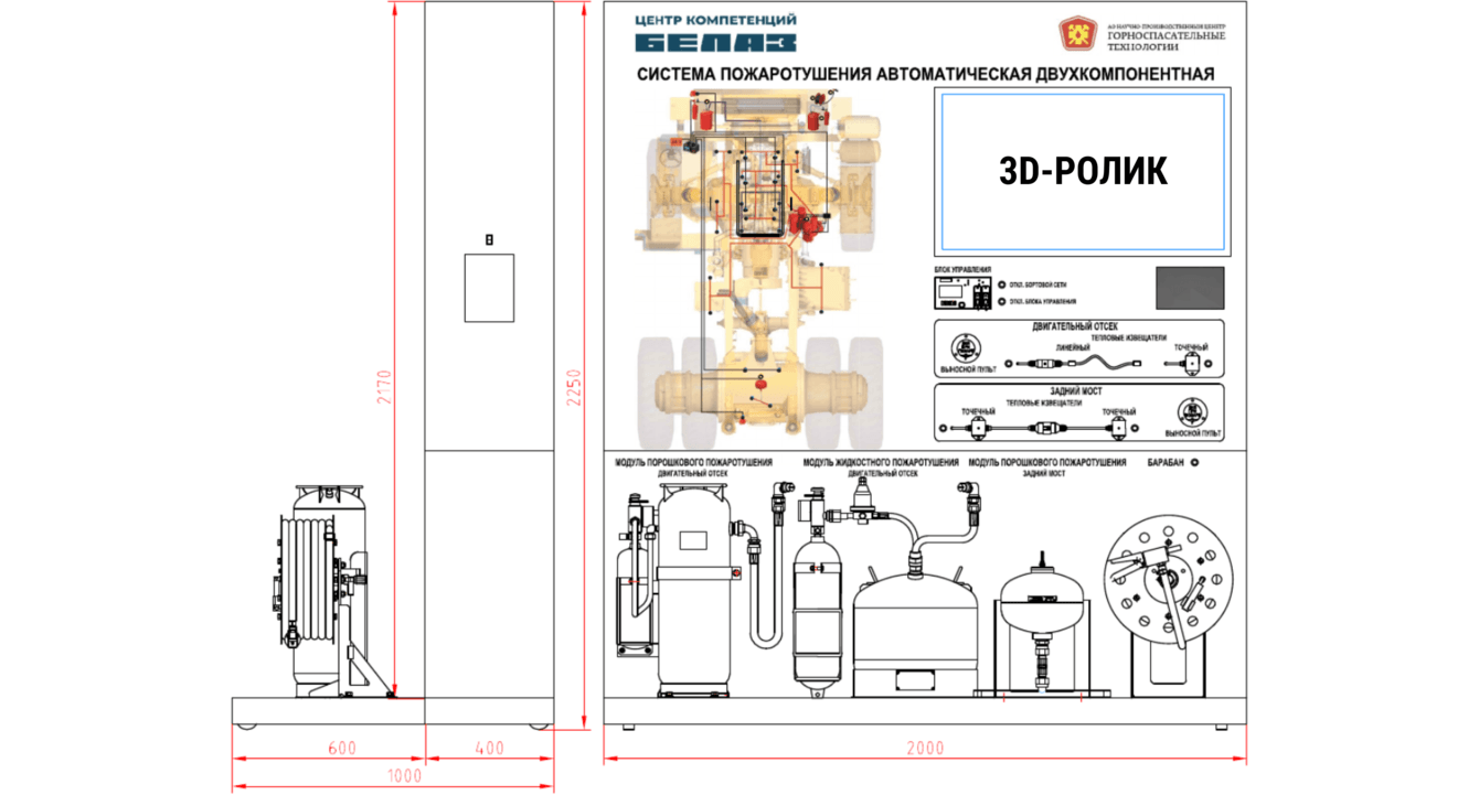 Нам пришла в голову идея создать демонстрационный интерактивный стенд, предназначенный для обучения будущих инженеров на базе Санкт-Петербургского горного университета. В данном стенде полностью представлена наша продукция системы пожаротушения для карьерного самосвала «БелАЗ».