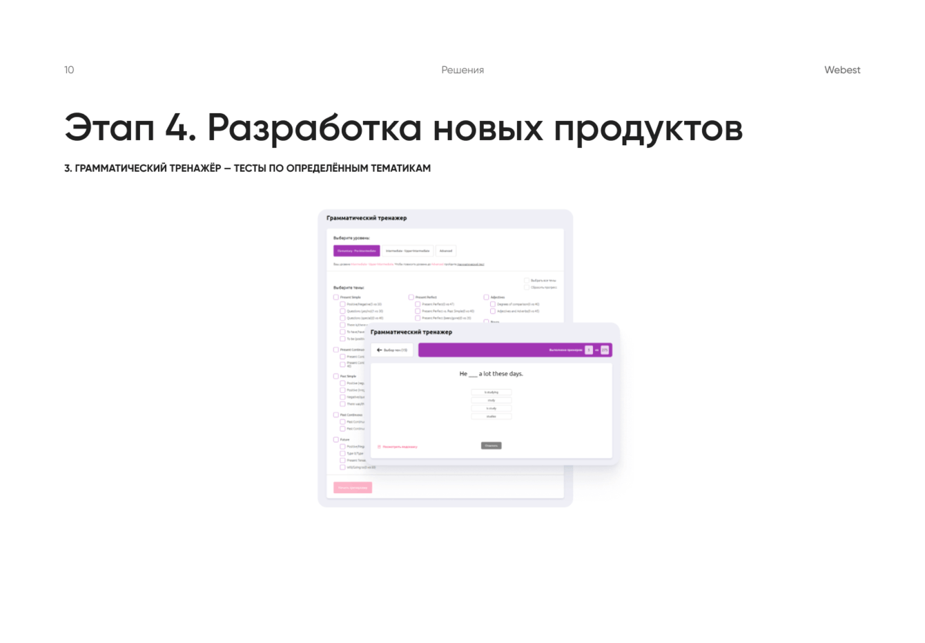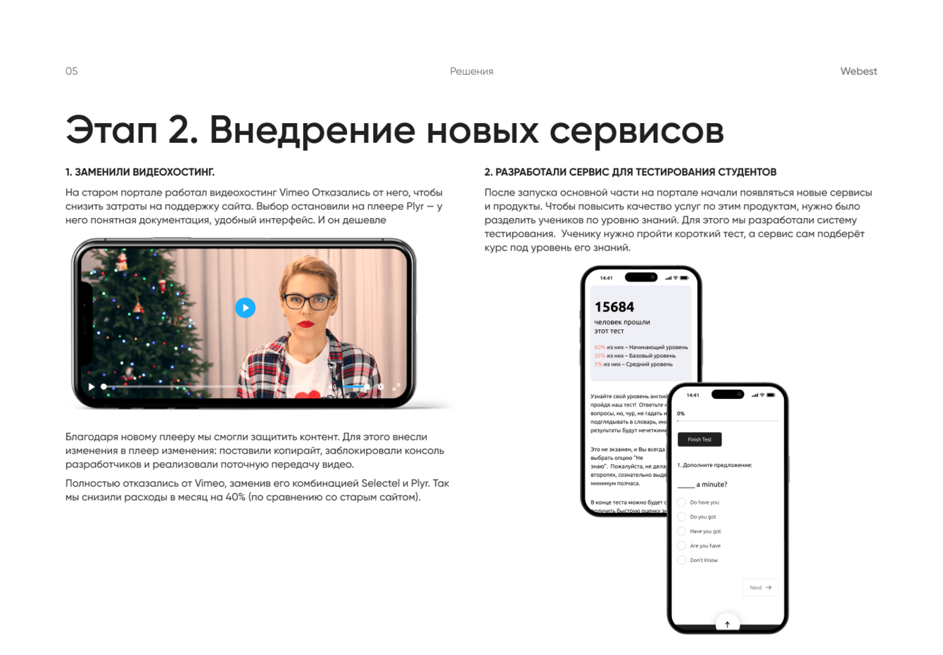 После запуска основной части на портале начали появляться новые сервисы и продукты. Чтобы повысить качество услуг по этим продуктам, нужно было разделить учеников по уровню знаний. Для этого мы разработали систему тестирования. Ученику нужно пройти короткий тест, а сервис сам подберёт курс под уровень его знаний.