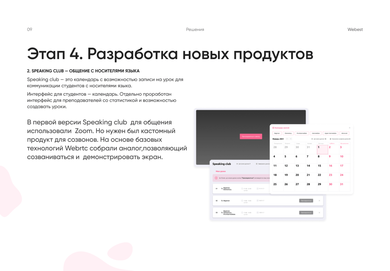 В первой версии Speaking club для общения использовали Zoom. Но нужен был кастомный продукт для созвонов.. На основе базовых технологий Webrtc собрали аналог,позволяющий созваниваться и демонстрировать экран.