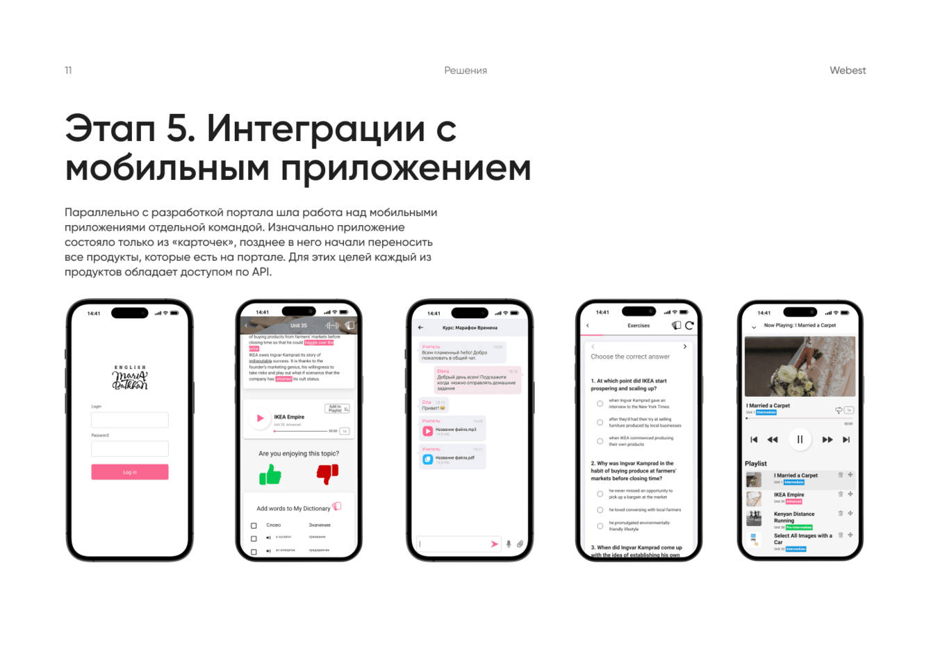 Параллельно с разработкой портала шла работа над мобильными приложениями отдельной командой. Изначально приложение состояло только из «карточек», позднее в него начали переносить все продукты, которые есть на портале. Для этих целей каждый из продуктов обладает доступом по API.