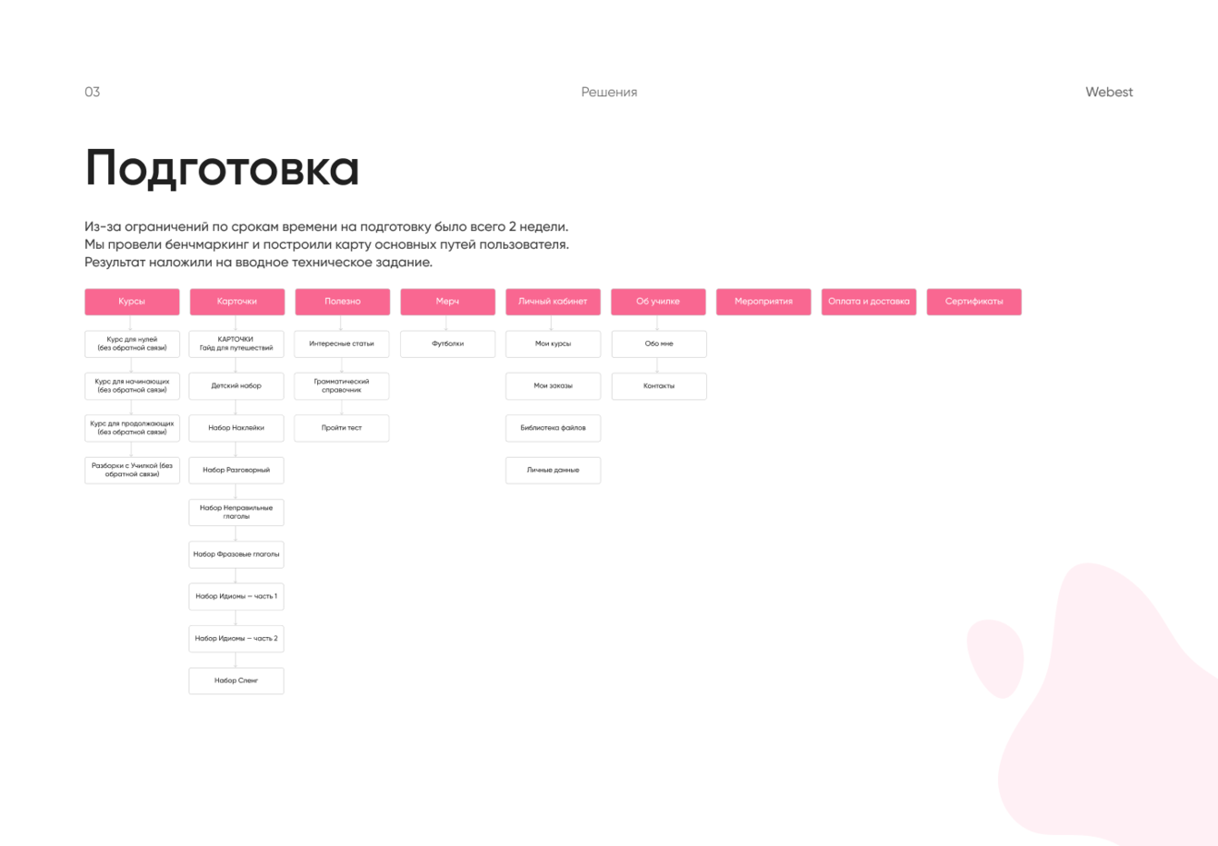 Из-за ограничений по срокам времени на подготовку было всего 2 недели. Мы провели бенчмаркинг и построили карту основных путей пользователя. Результат наложили на вводное техническое задание.