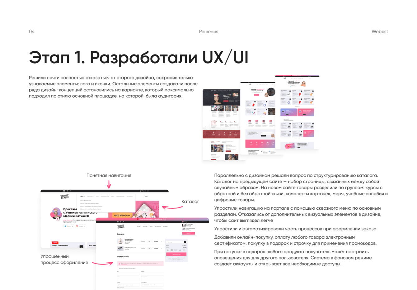 Параллельно решался вопрос с позиционированием. При разработке портала учитывали конвертацию лайфхаков в обучающую платформу под личным брендом. Требовалось автоматизировать ряд процессов, которые выполнялись руками администраторов: выдача сертификатов, контроль и продление доступов. Разработать единый визуальный стиль для всех продуктов и каналов коммуникации.