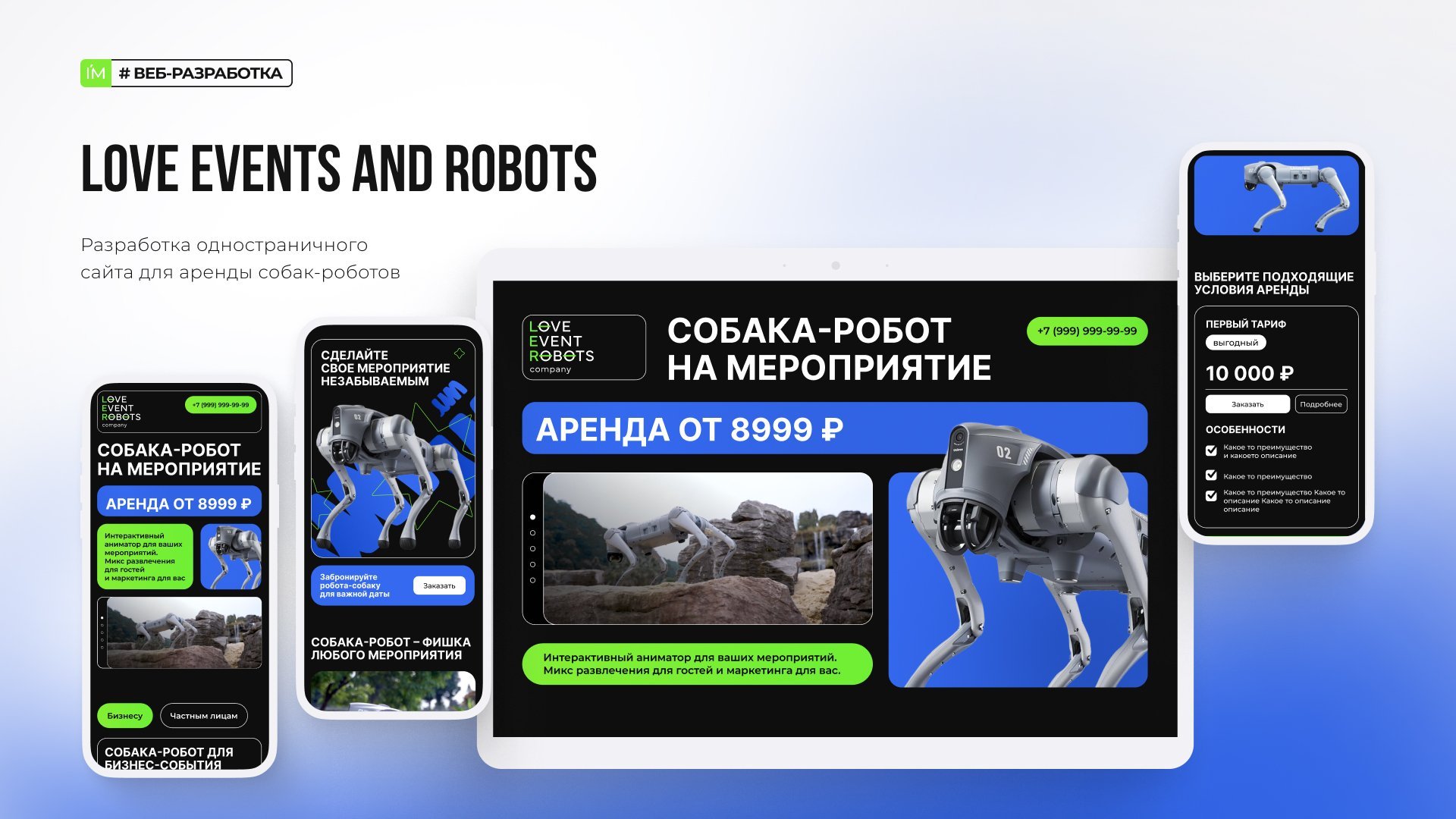 Дизайн данного сайта основан на двух особенностях: активное использование видеоформатов и анимации, с целью показать возможности и потенциал робота-собаки; иллюстрация способов применения, визуальное разделение целевой аудитории на бизнес (тех, кто арендует робота для привлечения внимания к своим промо-стойкам на конференциях) и частным лицам (праздники, дни рождения и т.п.)