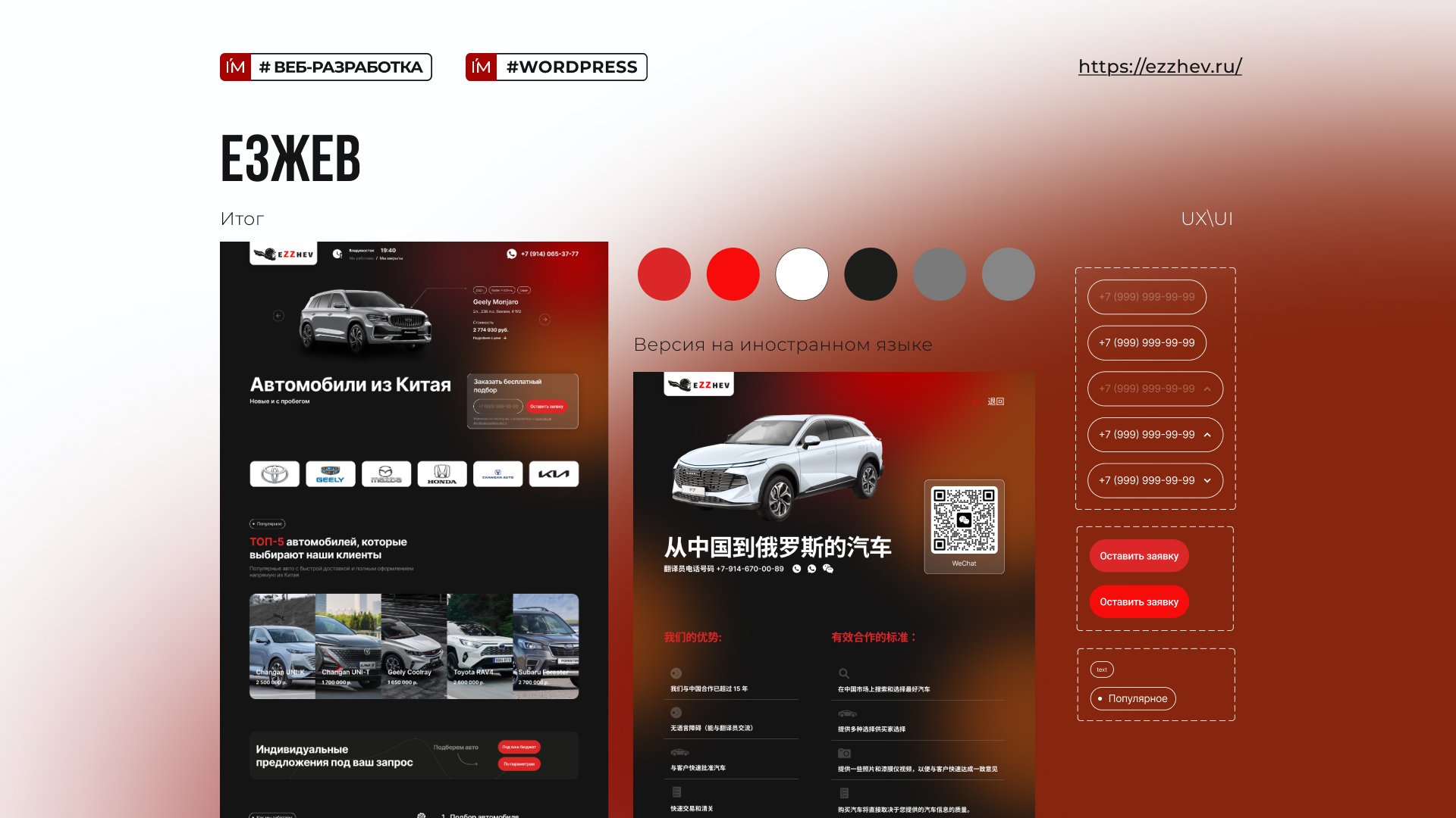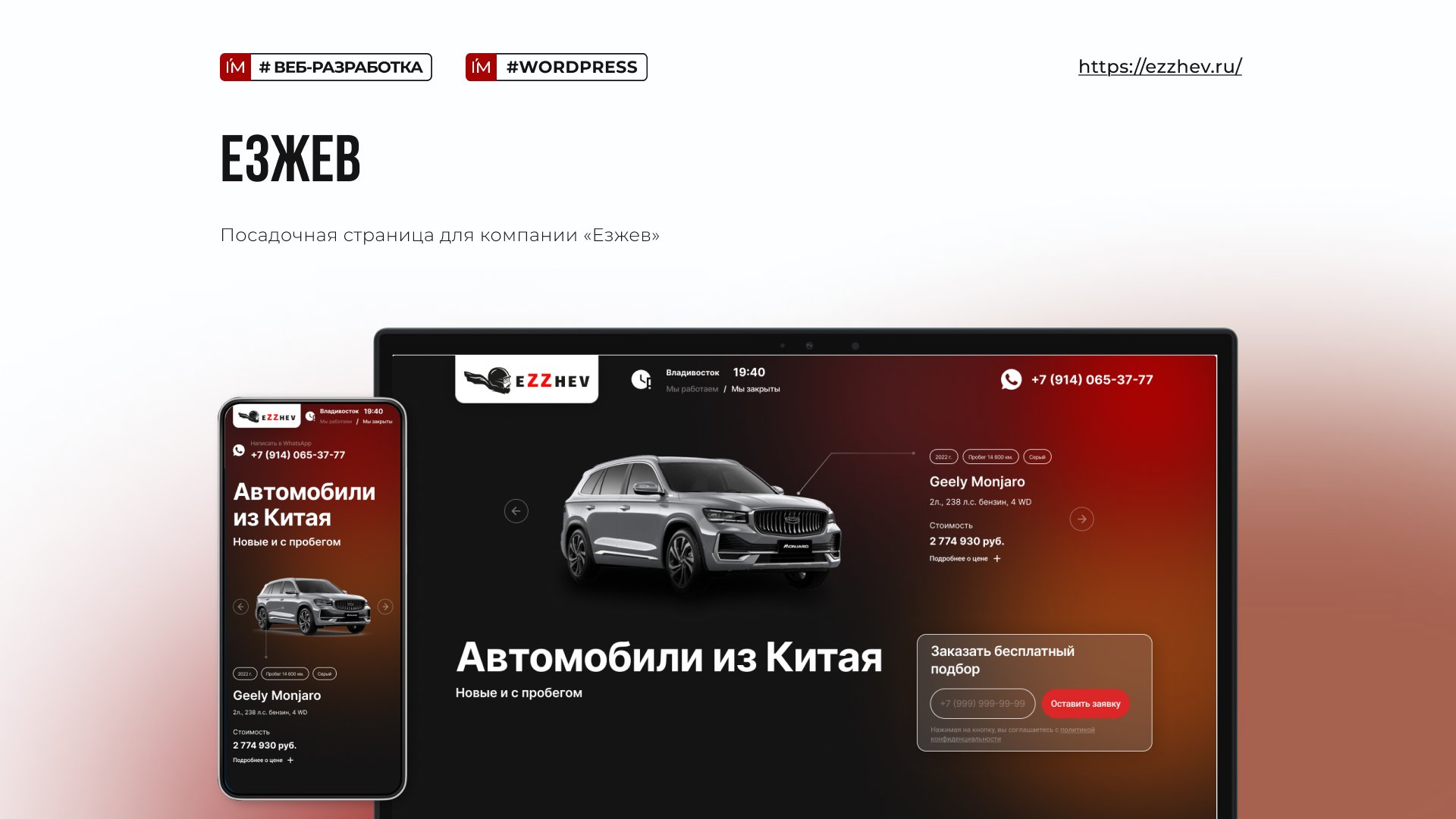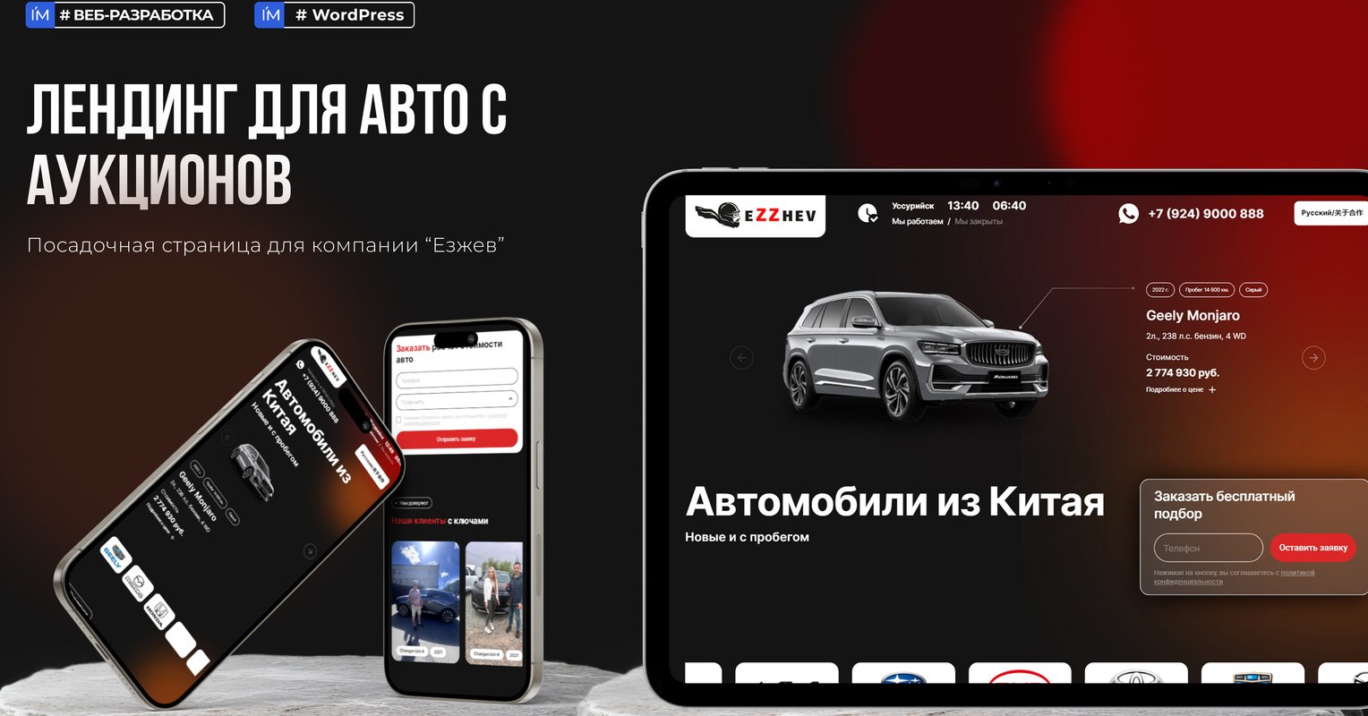 Компания Ezzhev, специализирующаяся на подборе, покупке и таможенном оформлении автомобилей из Китая, Кореи и Японии, обратилась с запросом на разработку современного одностраничного сайта. Основные цели: