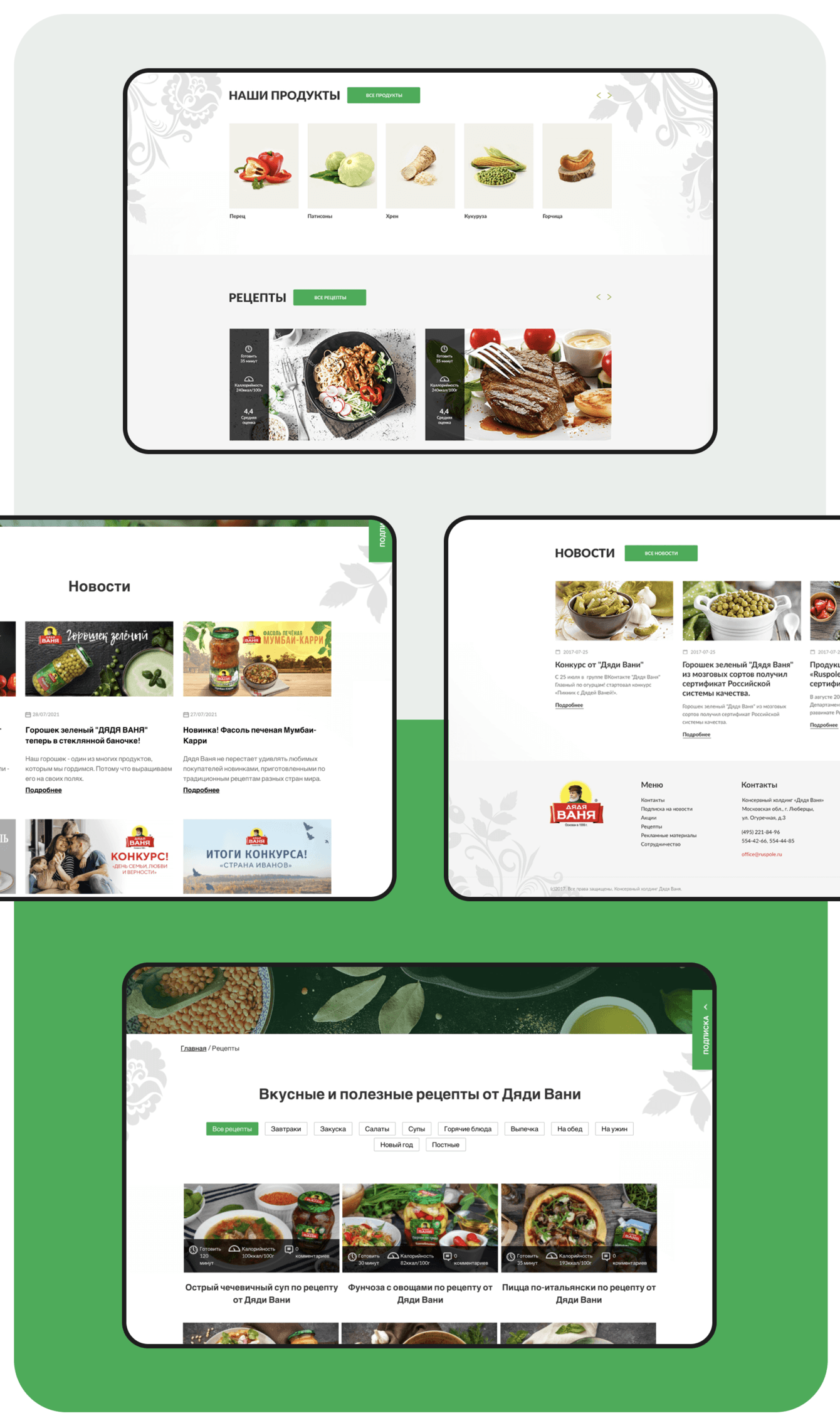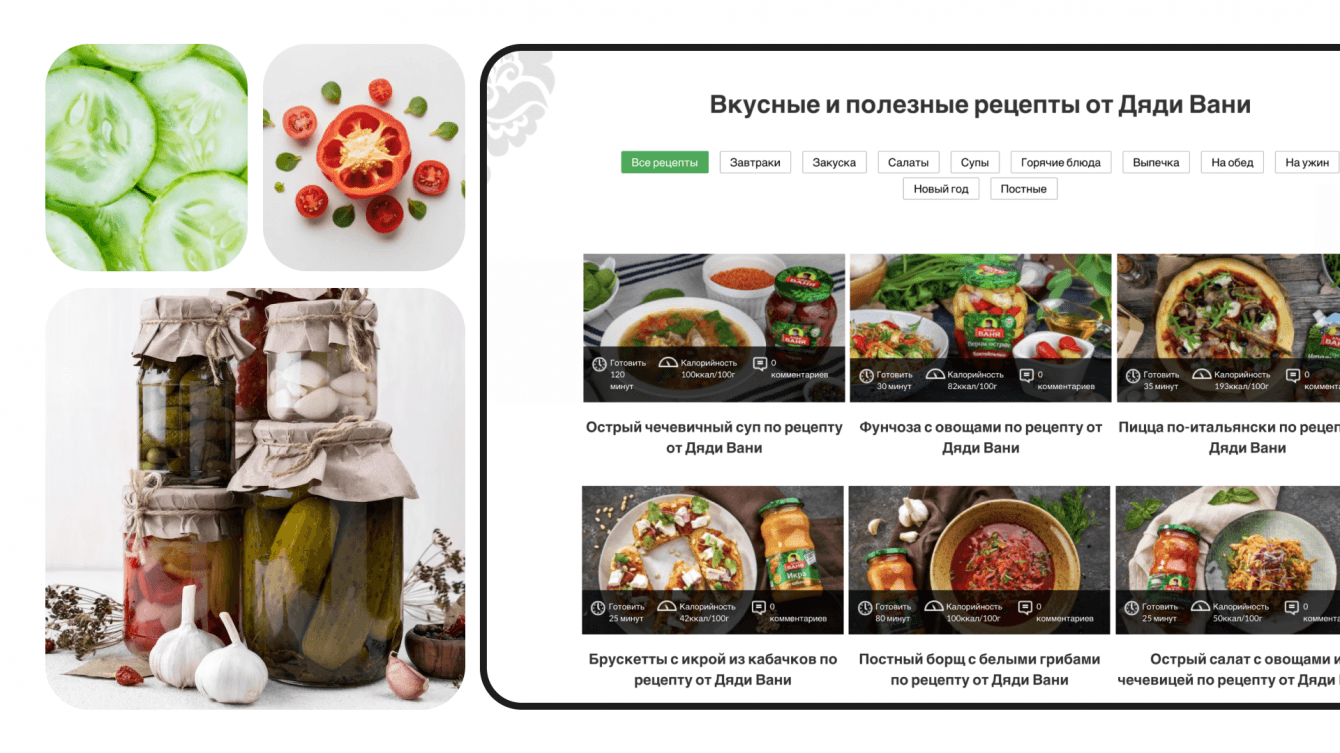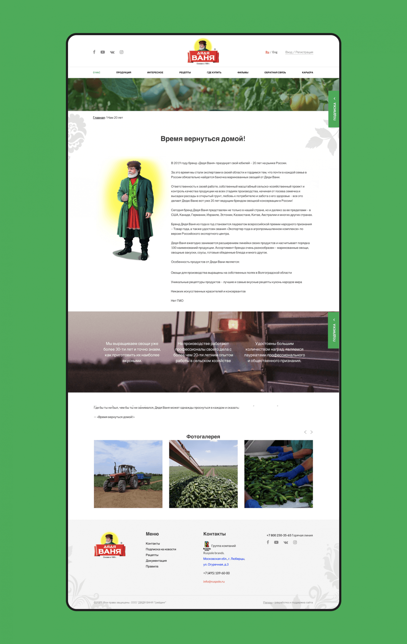 Перед сайтом стояла задача не просто информировать людей о существовании консервированной продукции от «Дяди Вани», но и вовлекать во взаимодействие. Для этого требовалось разработать личный кабинет, создать новые разделы (такие как «рецепты», «фильмы») и реализовать возможность вовлечения пользователей различными конкурсами.