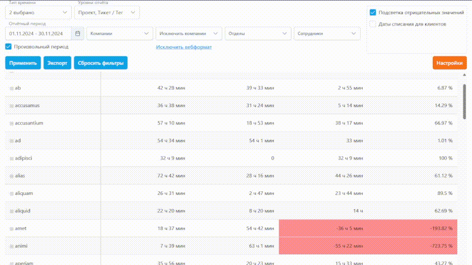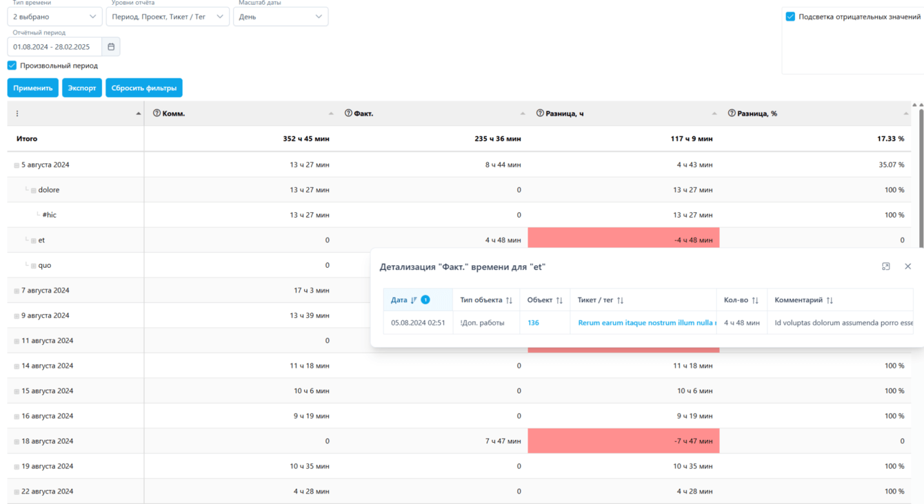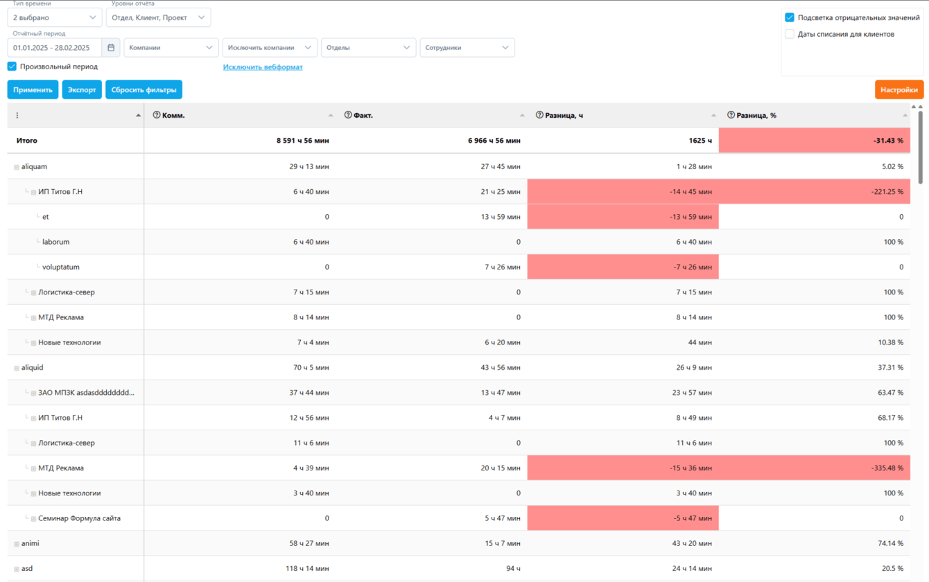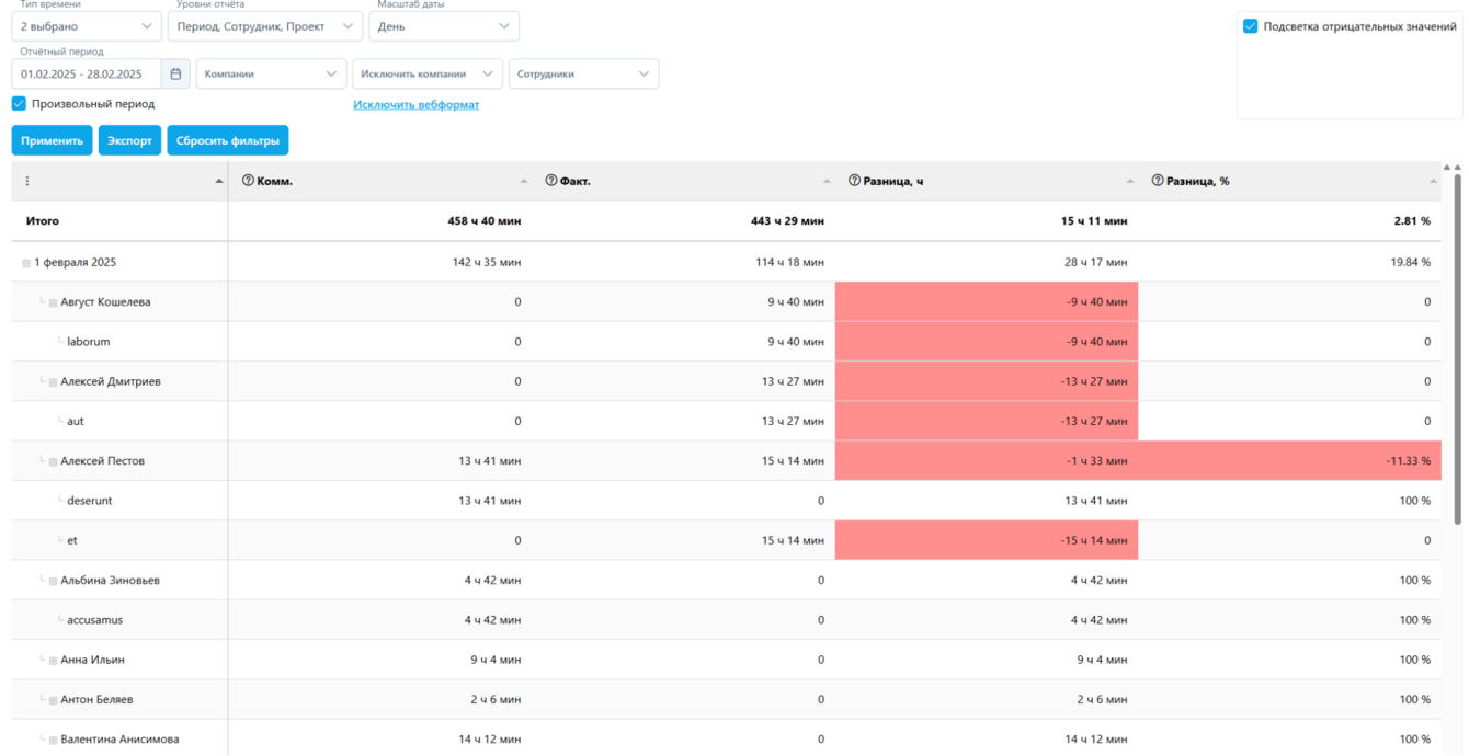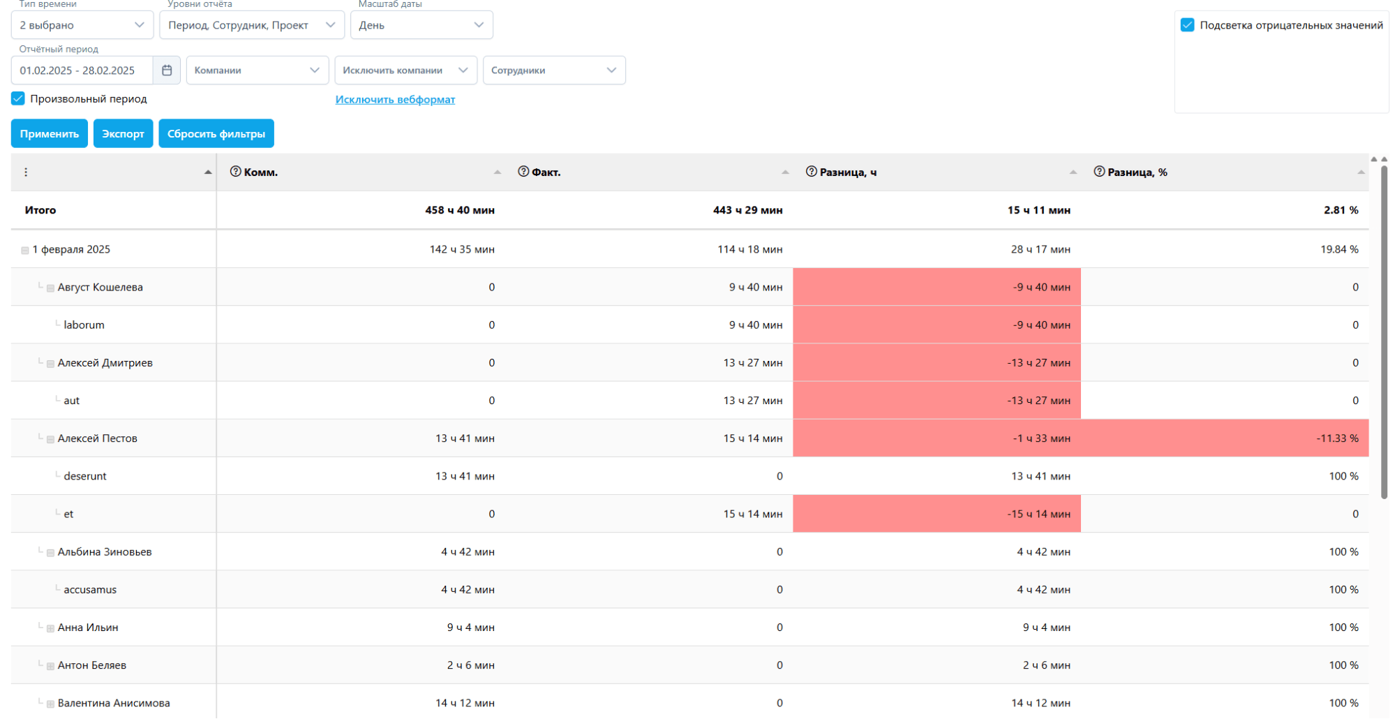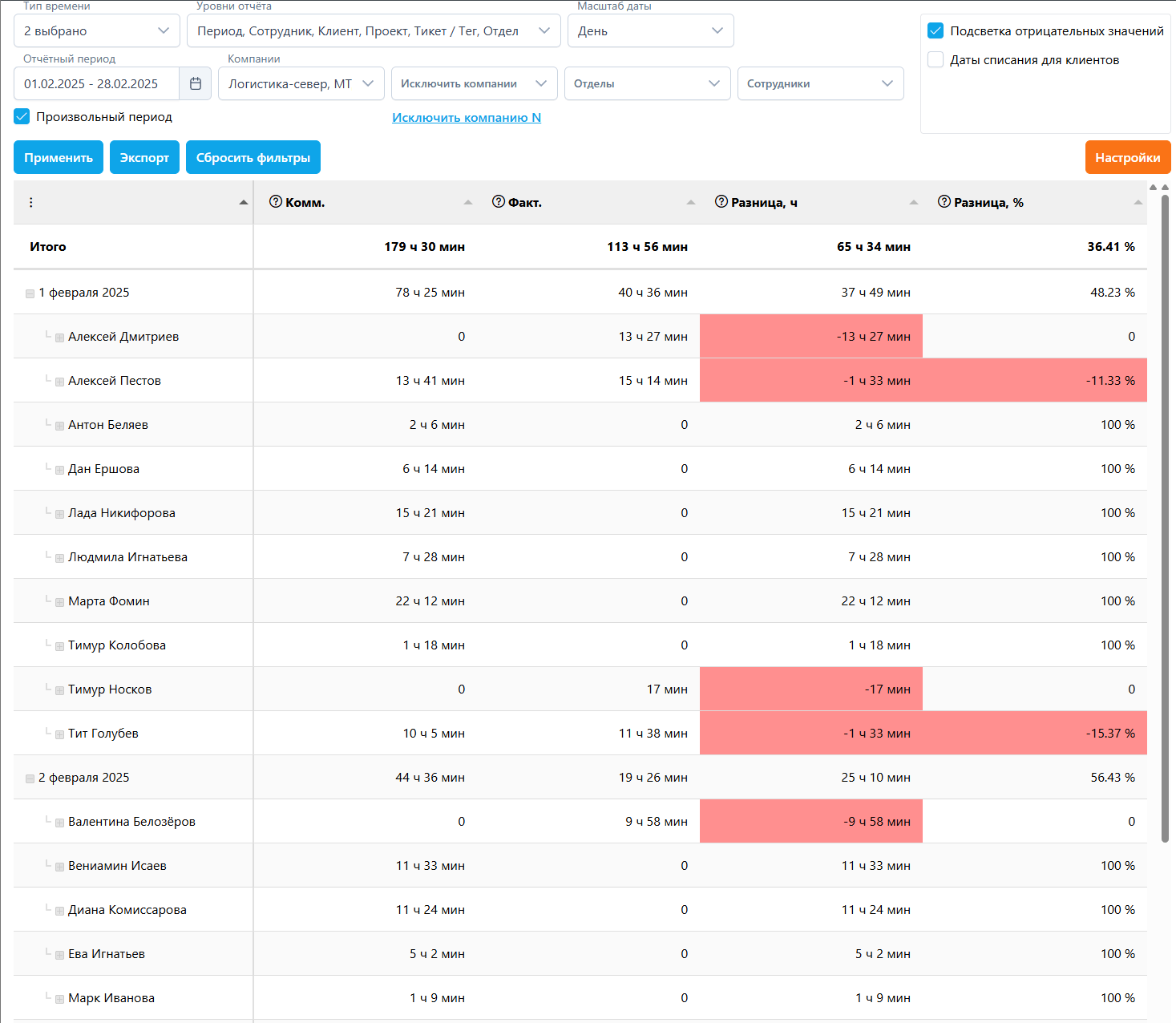 • Разница (%) – доля разницы в часах от коммерческих часов.