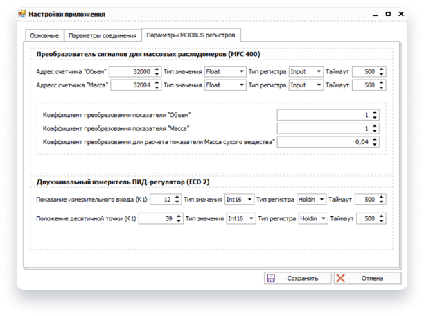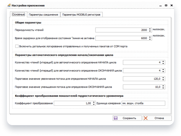Все параметры, которые используются для автоопределения начала/окончания цикла наполнения, подключения к COM-порту, считывания данных с определенных регистров устройств, преобразования полученных данных, сохраняются и редактируются через отдельное окно настроек.