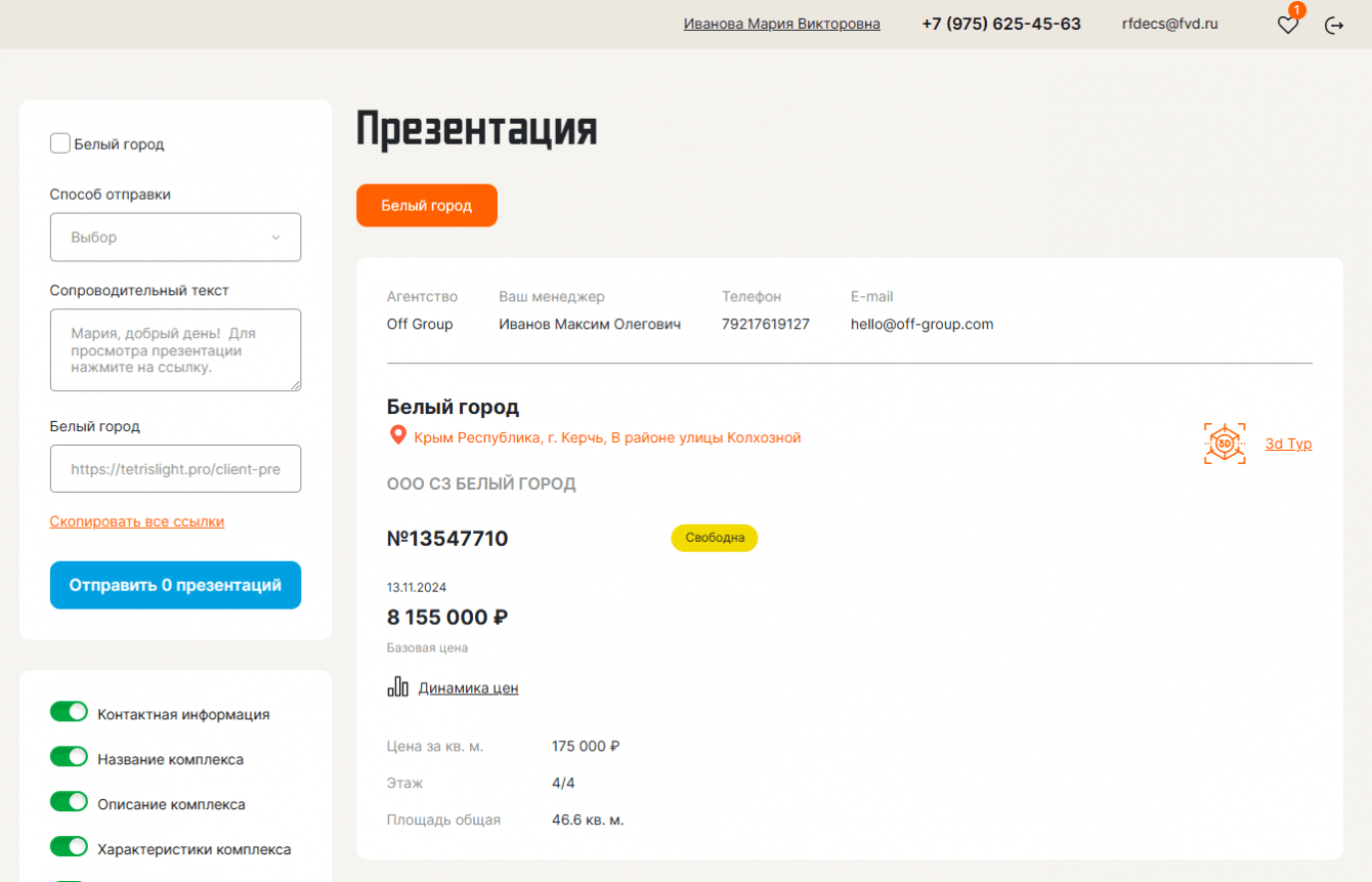 На сайте, после авторизации, клиентам (риелторам) будет доступен каталог объектов недвижимости, объекты можно будет ис-кать по фильтрам, и формировать из нужных объектов презентацию для потенциального покупателя.