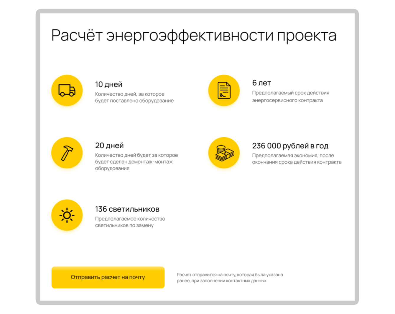 Пользователи заполняют информацию по типу помещения, площади и тарифу. Портал рассчитывает примерную энергоэффективность объекта и выводит следующие показатели: необходимое время для монтажа нового оборудования, количество светильников на замену, срок действия контракта и предполагаемая экономия от замены.