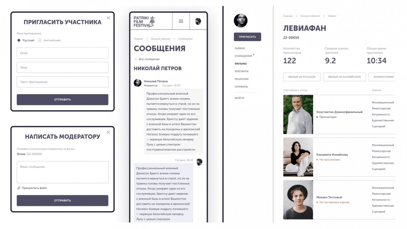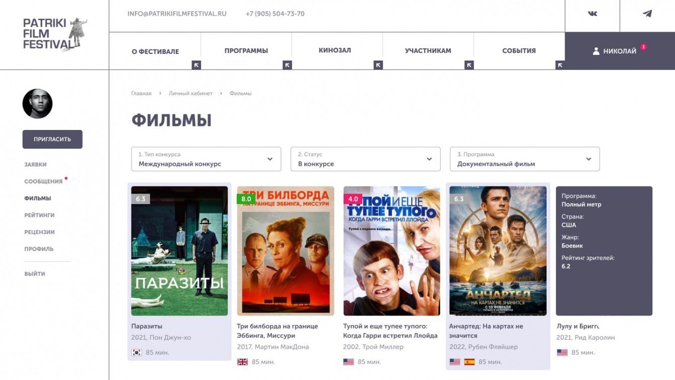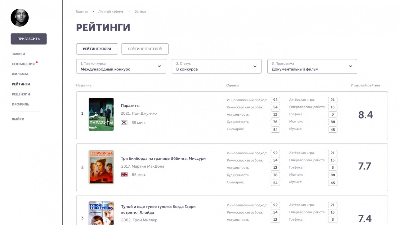 Мы разработали личный кабинет с широким функционалом для добавления и структурирования фильмов фестиваля, обмена сообщениями, оценки фильмов. Пользователей разделили на несколько ролей. Постарались упростить взаимодействие, сделать использование кабинета простым и понятным. Разработали нужные страницы сайта для индивидуальной презентации и онлайн-просмотра фильмов.