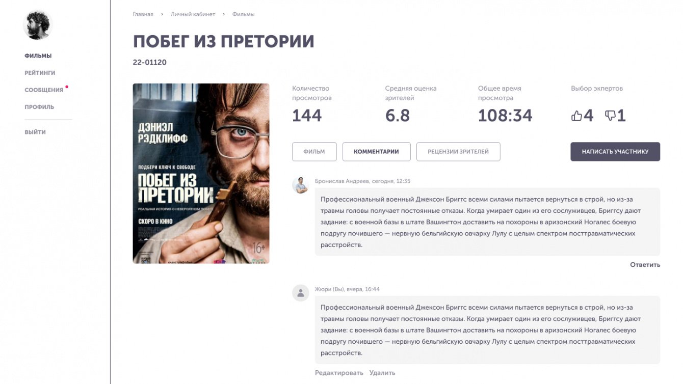 В личном кабинете "Жюри" отображаются фильмы с выставленными оценками. Просмотр недосмотренного фильма начинается с момента последней остановки. Жюри видит только те фильмы, в которых проставлен модератором статус "В конкурс", то есть члены жюри видят только те фильмы, которые заявлены в той программе, которую они оценивают.