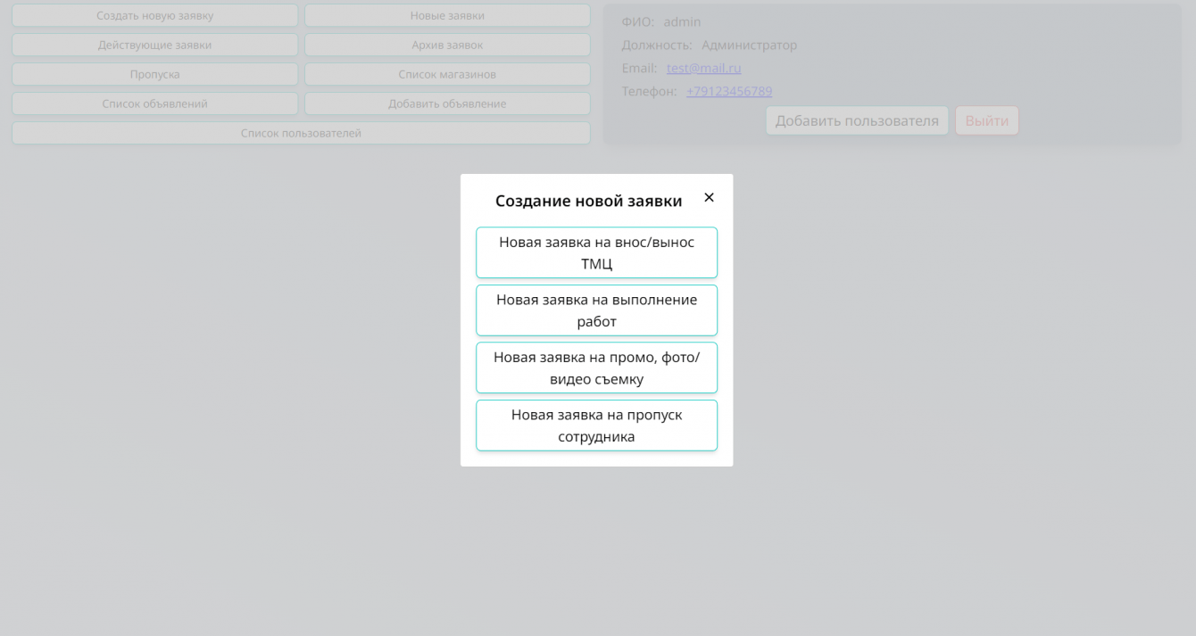 4. Портал должен обеспечивать возможность создания, просмотра, редактирования, согласования и отказа в согласовании электронных заявок на различные виды работ (внос/вынос материалов, выполнение работ, пропуск сотрудников, промо/фото).