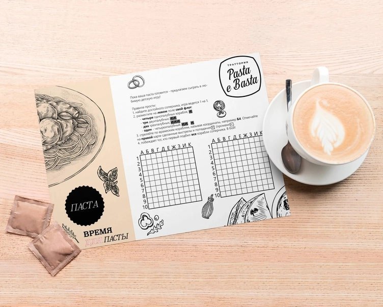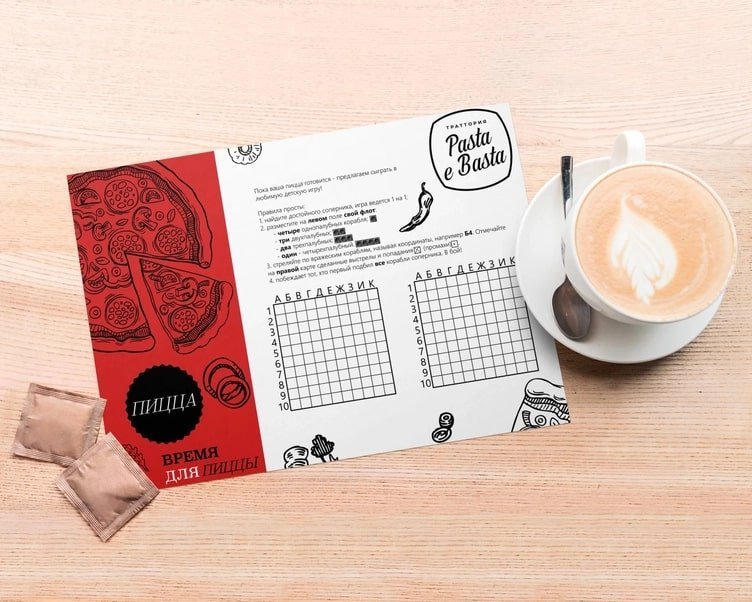 После выполнения данного дизайна заказчик и я посчитали, что как текст ни ужимай, получается уродливо. Мною было предложено размещение игры "Морской бой": траттория находится в бизнес-центре, а, следовательно, у каждого потенциального клиента есть авторучка.