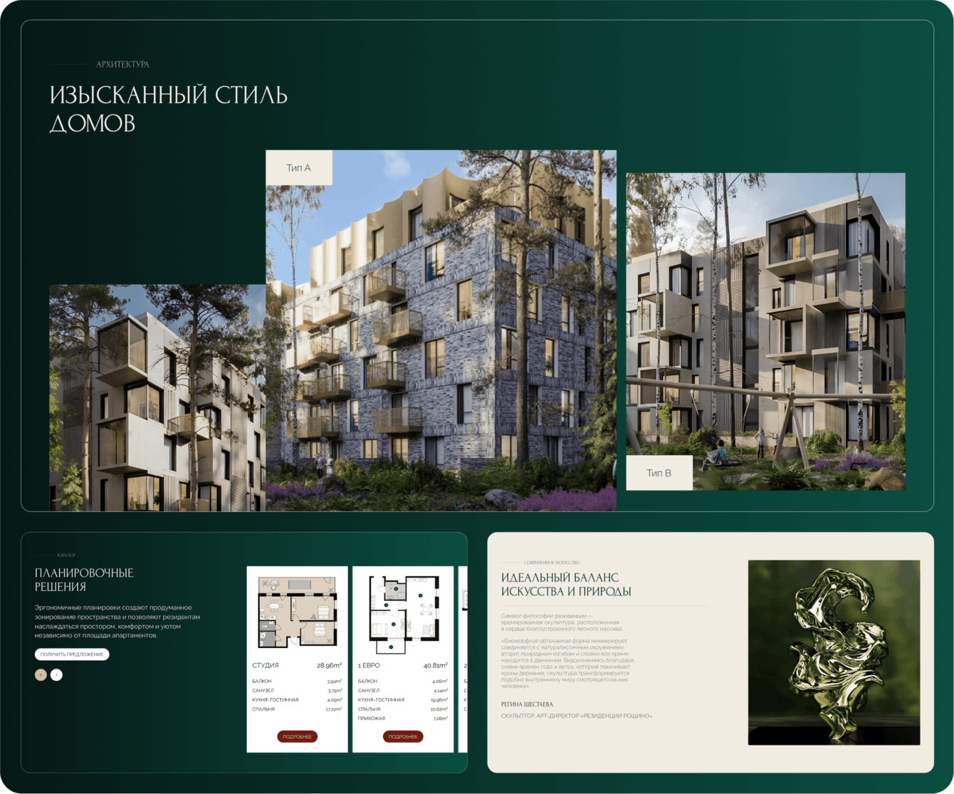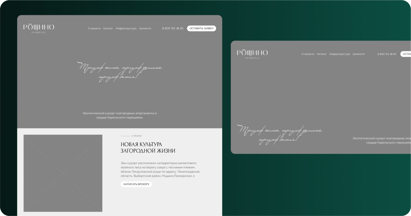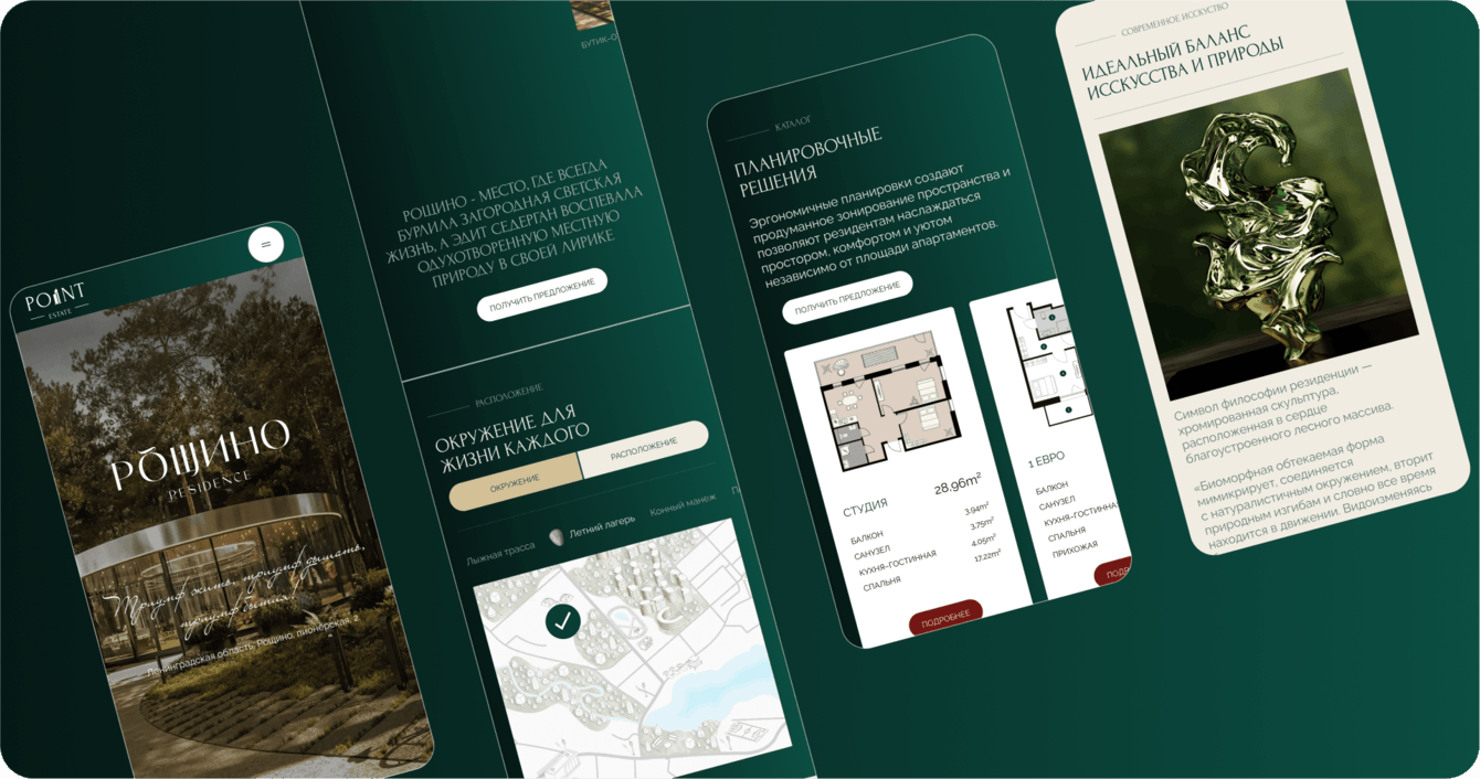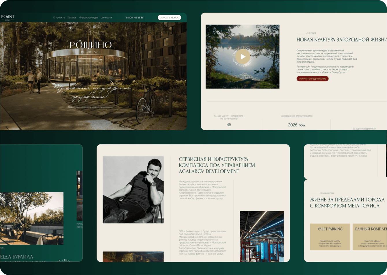 Затем началась работа над детальной проработкой всех страниц. Основные акценты были сделаны на главной странице с блоками, представляющими проект; информационных блоках, описывающих инфраструктуру и преимущества поселка; галерее с качественными изображениями. Также мы использовали плавную анимацию для повышения вовлеченности и интереса пользователей. Особое внимание уделили скроллингу, что позволило сделать восприятие сайта более живым и интерактивным без перегрузки визуальными эффектами.