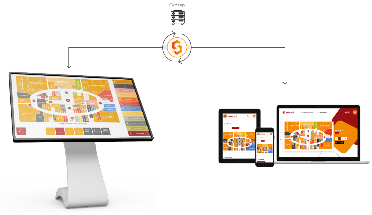 Наша команда разработала веб-сайт, который не только предоставлял информацию о торговом центре, но и интегрировался с физическим пространством, создавая единый пользовательский опыт: карта на интерактивных стендах в самом ТЦ работает с сервера, на котором расположен сайт, это один и тот же элемент.