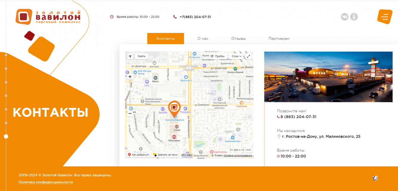Внедрение кастомного элемента в виде логотипа в качестве геопоинтера на карте позволило усилить визуальную идентичность торгового центра. Такое решение не только создает прямую ассоциацию между брендом и его местоположением, но и способствует более быстрому запоминанию местоположения торгового центра у посетителей сайта.