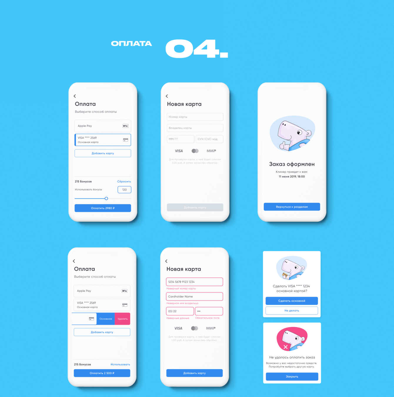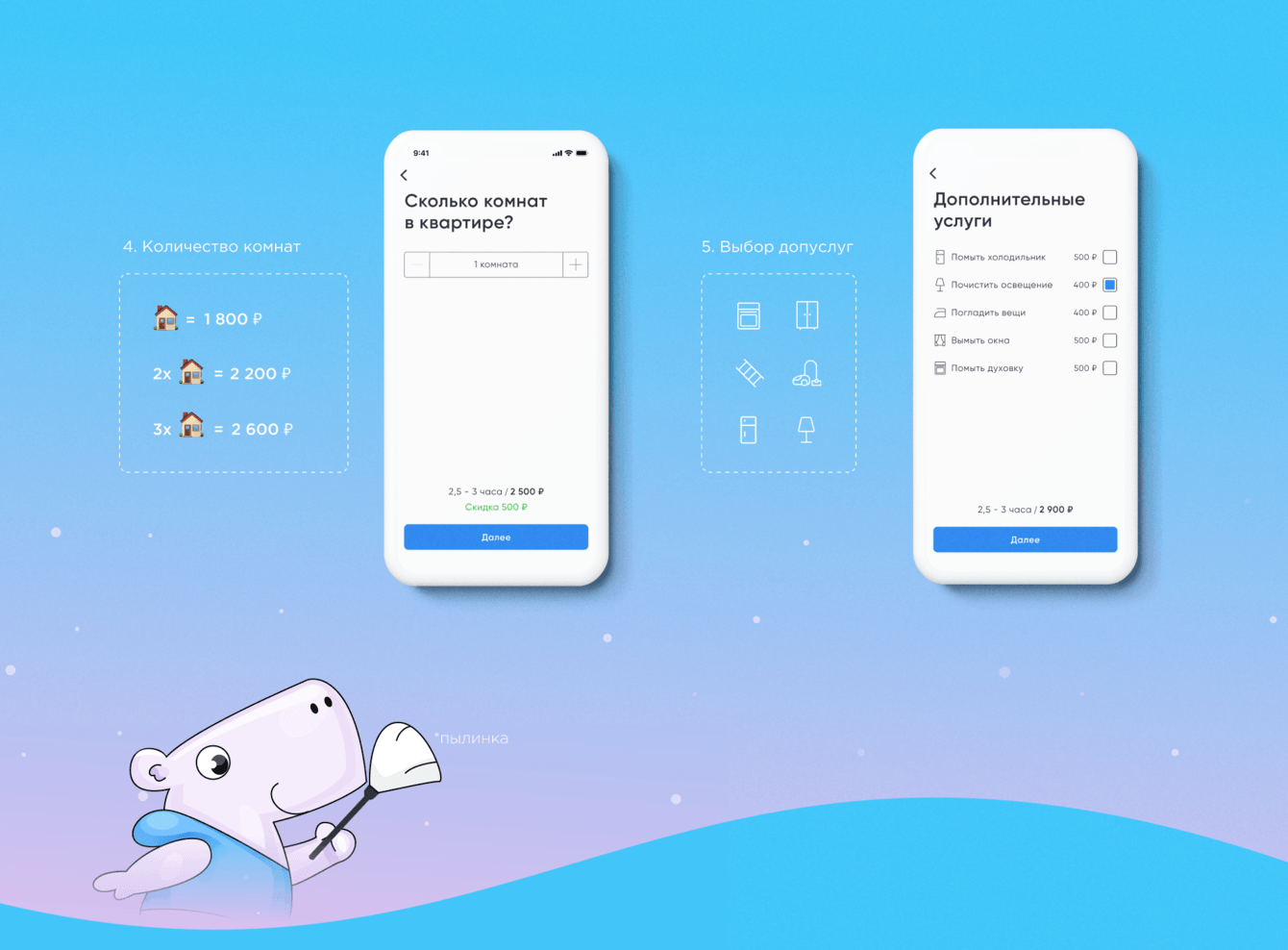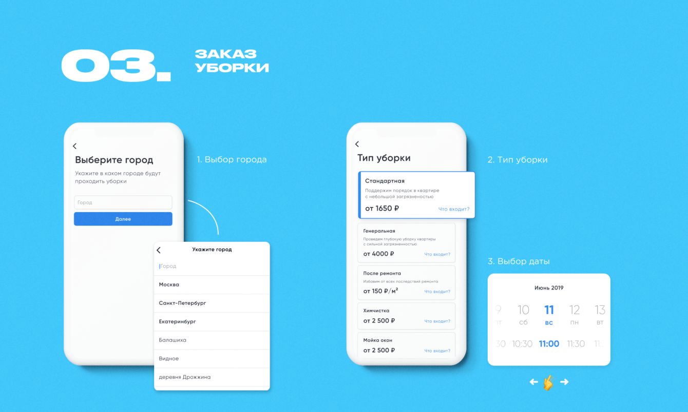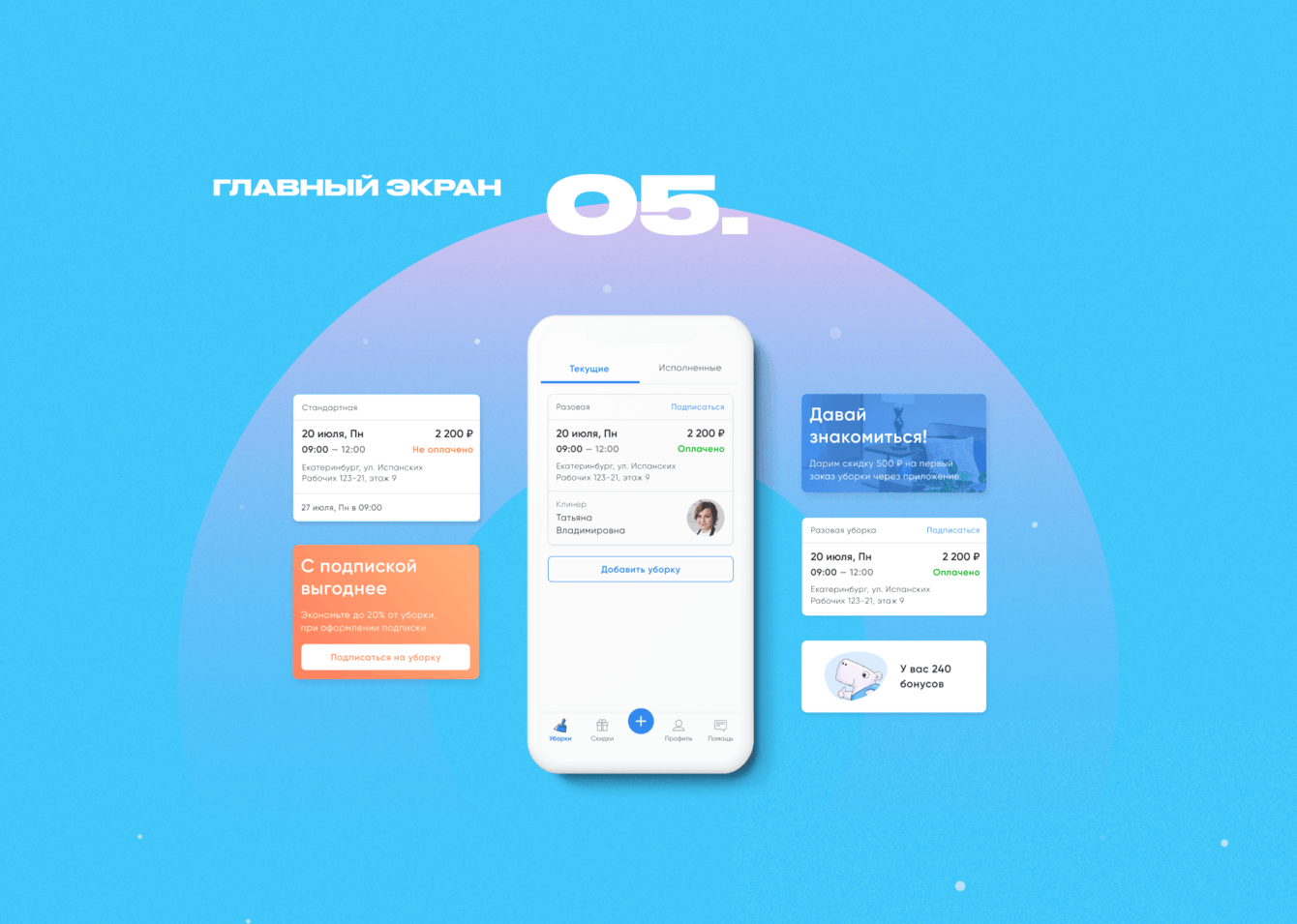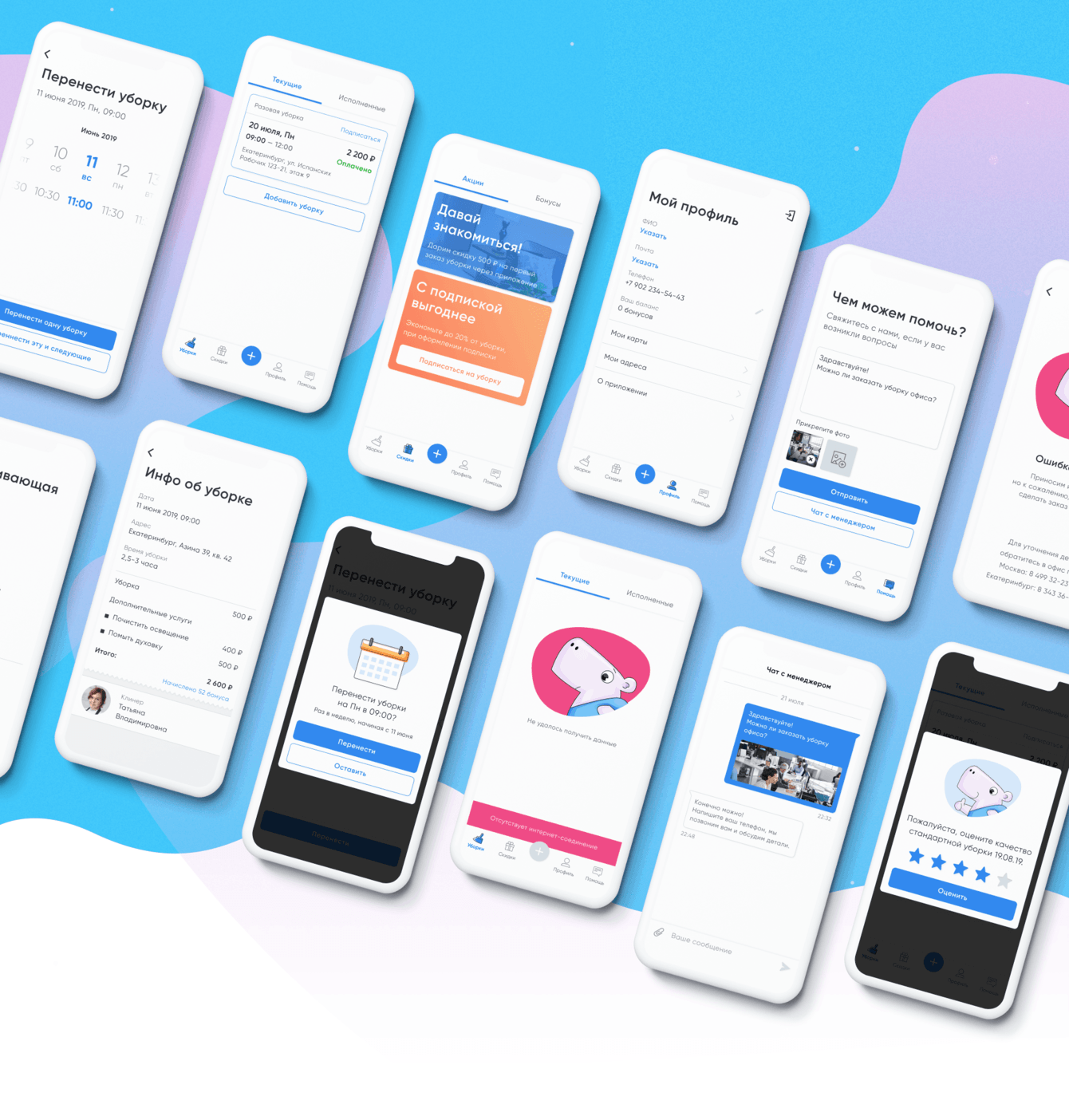 Мы разработали интуитивно понятное приложение, дизайн которого ассоциируется с оказываемыми услугами, чистотой, аккуратностью и домашним уютом.