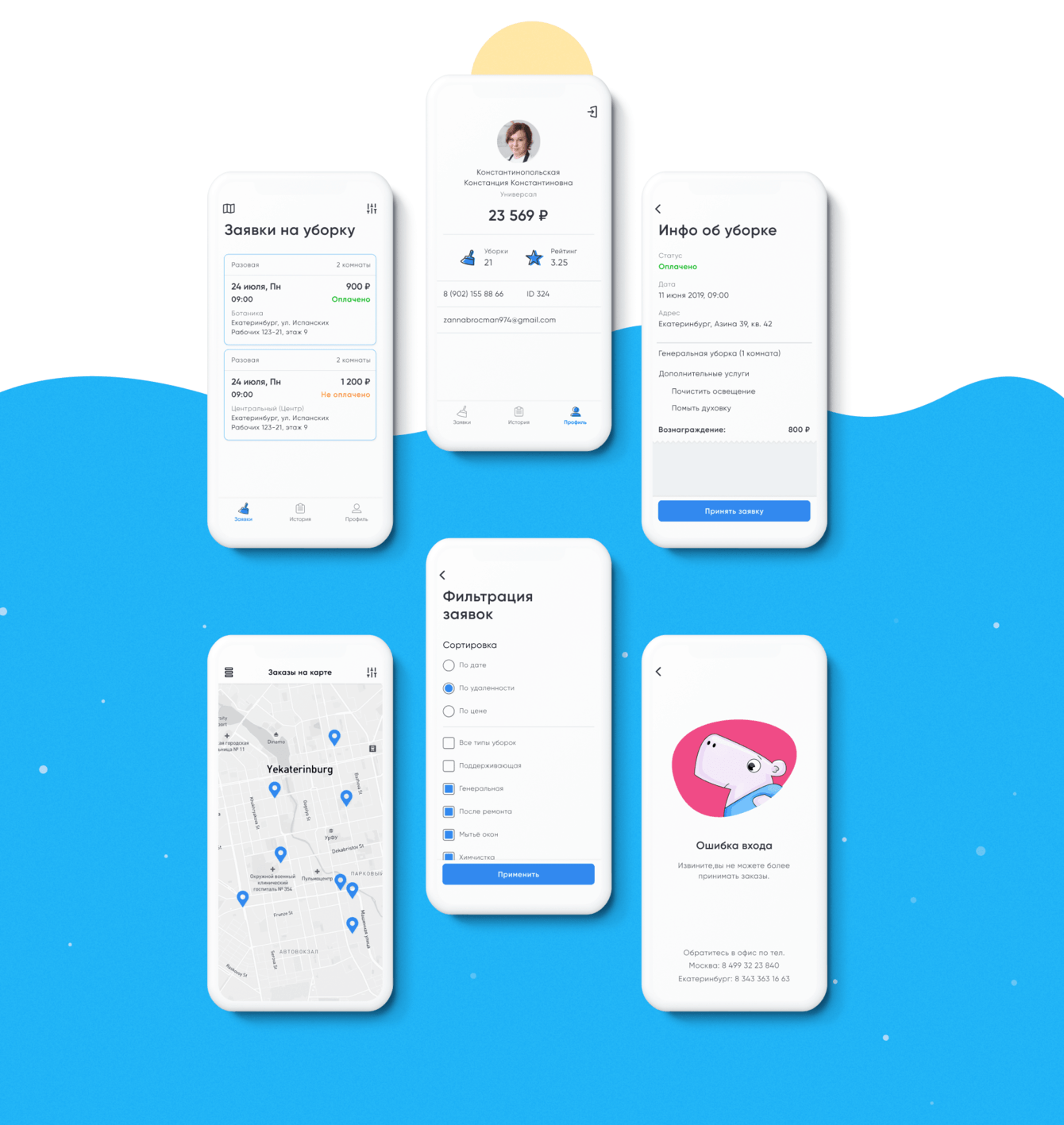 Мы разработали интуитивно понятное приложение, дизайн которого ассоциируется с оказываемыми услугами, чистотой, аккуратностью и домашним уютом.