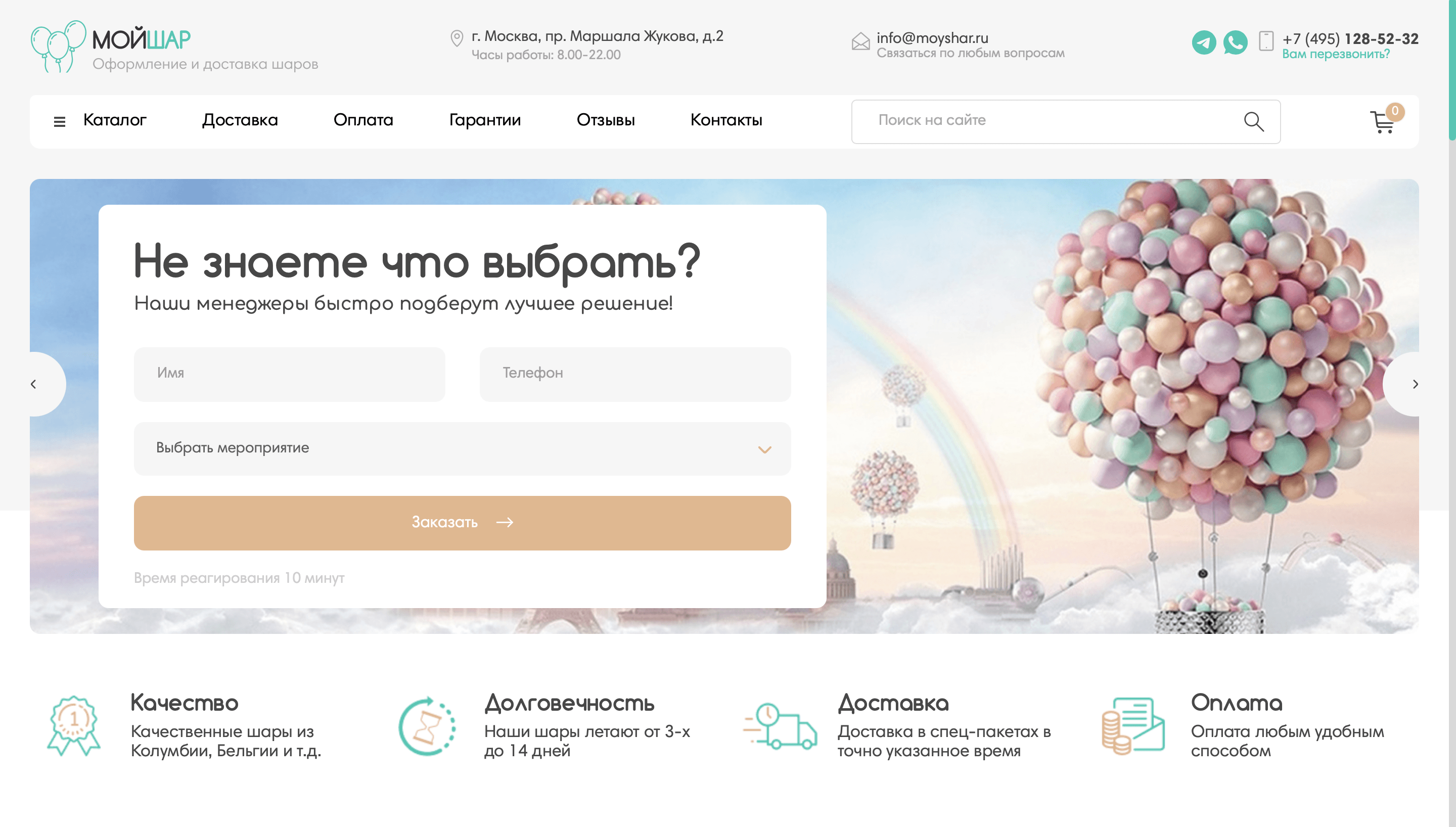 Создать современный, яркий и удобный сайт для компании «Мой Шар», который позволит клиентам быстро выбрать и заказать воздушные шары, оформить доставку в Москве и МО, а также получить всю необходимую информацию о товарах и услугах.