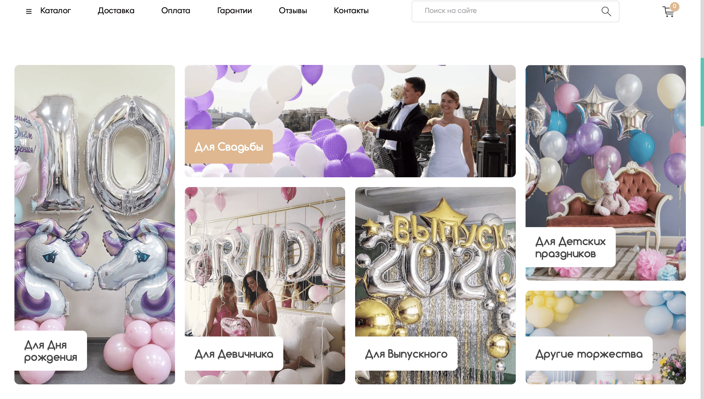 Реализовали удобный каталог с сортировкой по событию (свадьба, день рождения, выпускной и др.).