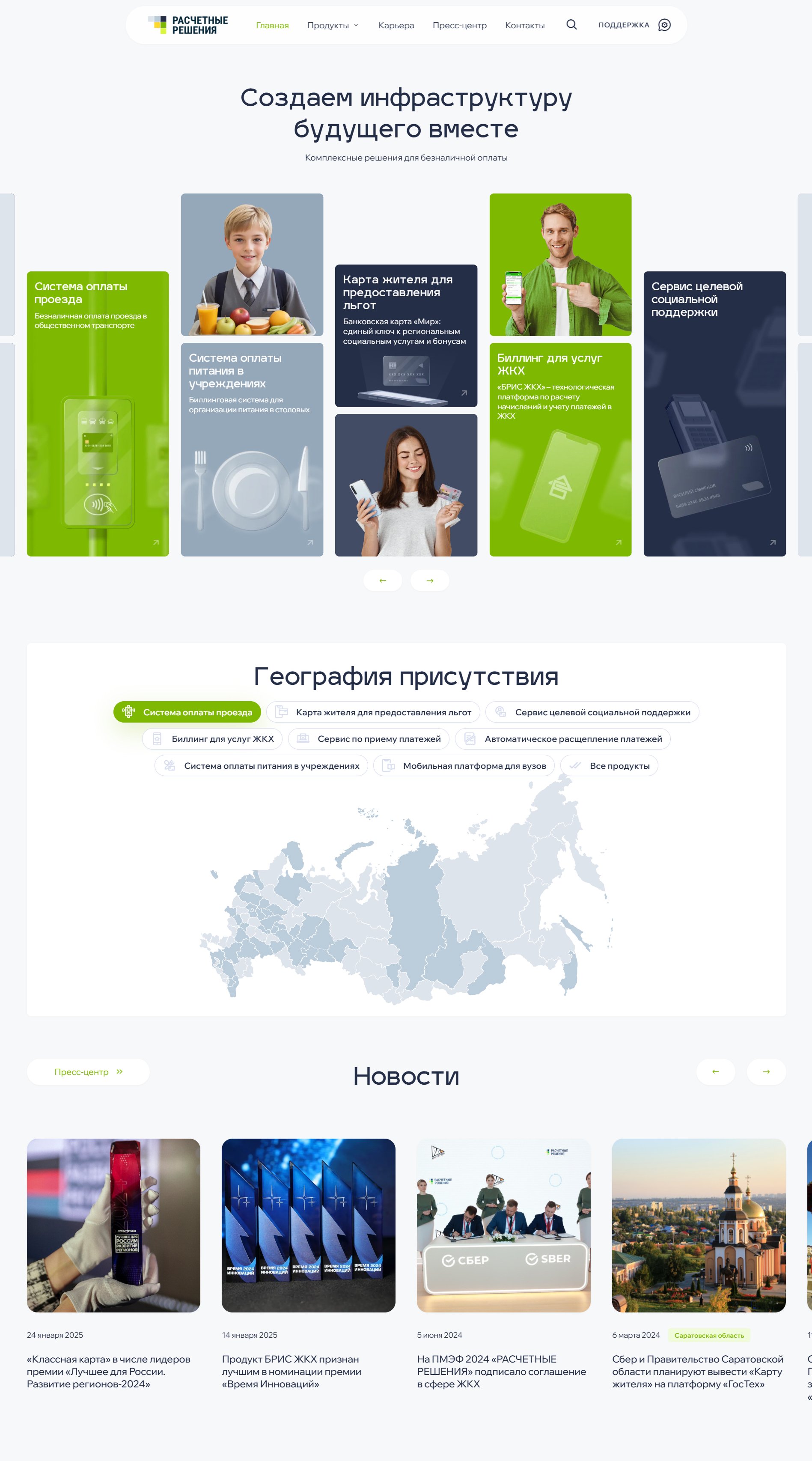 Через полгода после старта сотрудничества был запущен современный и удобный корпоративный сайт, который отвечает потребностям пользователей и демонстрирует технологичность компании. Он станет точкой притяжения для клиентов, партнеров и соискателей бренда благодаря следующим разделам: