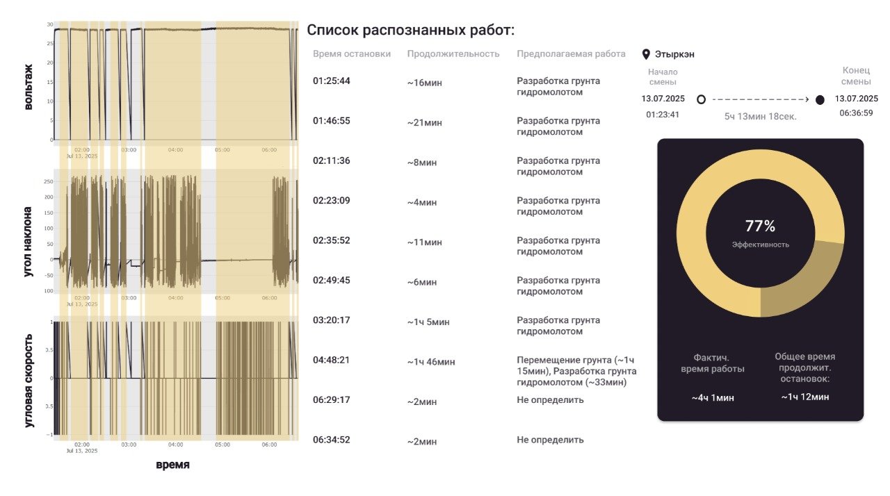 Для постоянного отслеживания состояния техники и контроля выполнения работ, в условии отсутствия сети, мы разработали датчик, который имеет встроенную память и записывает своё состояние, а именно: состояние электросети техники и положение датчика в пространстве относительно прошлого включения. С помощью собранных данных мы смогли обучить нейро алгоритм, который может определять состав выполняемых работ и их временной диапазон с точностью до 85%.