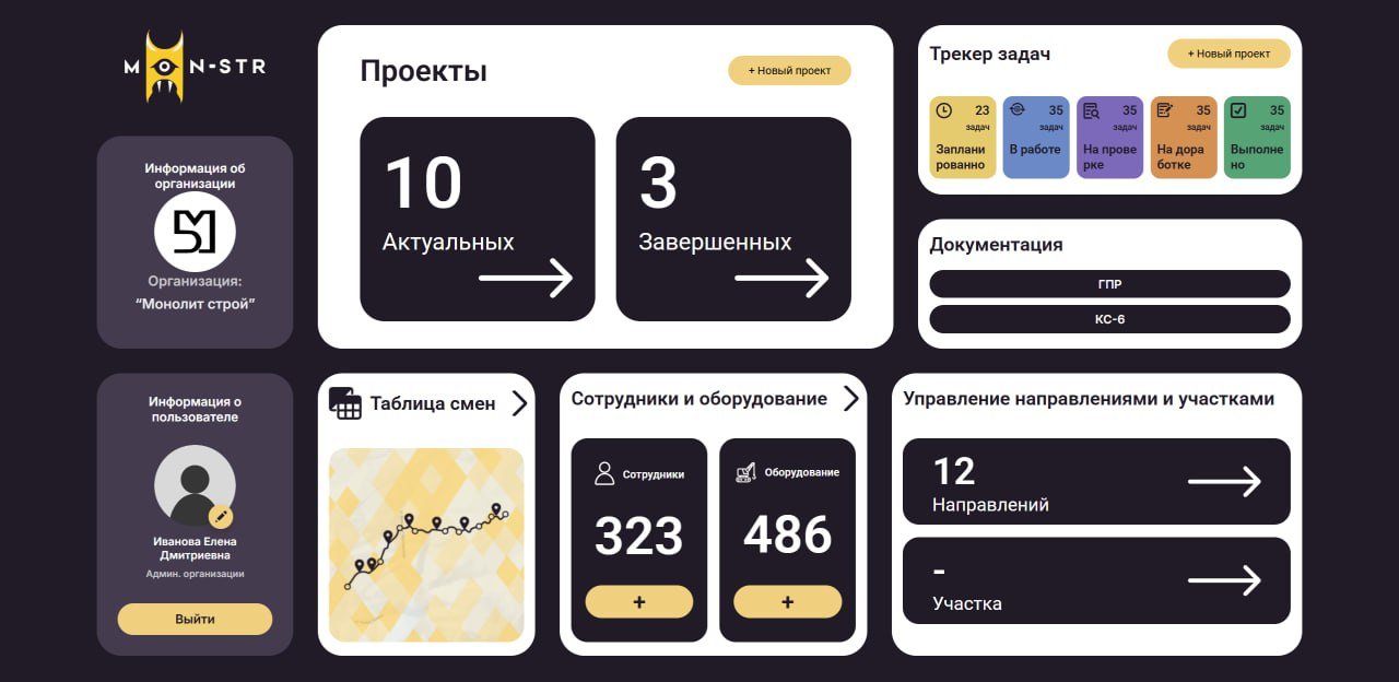 Для вывода всей информации мы разработали сайт, в котором постарались отразить всю информацию, получаемую с датчиков и мобильных устройств, а также добавили элементы контроля за персоналом и техникой