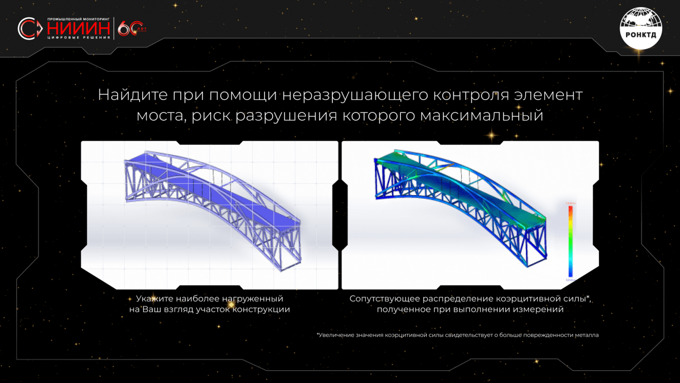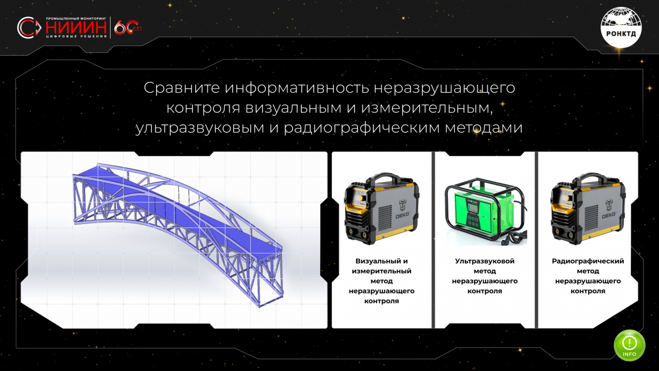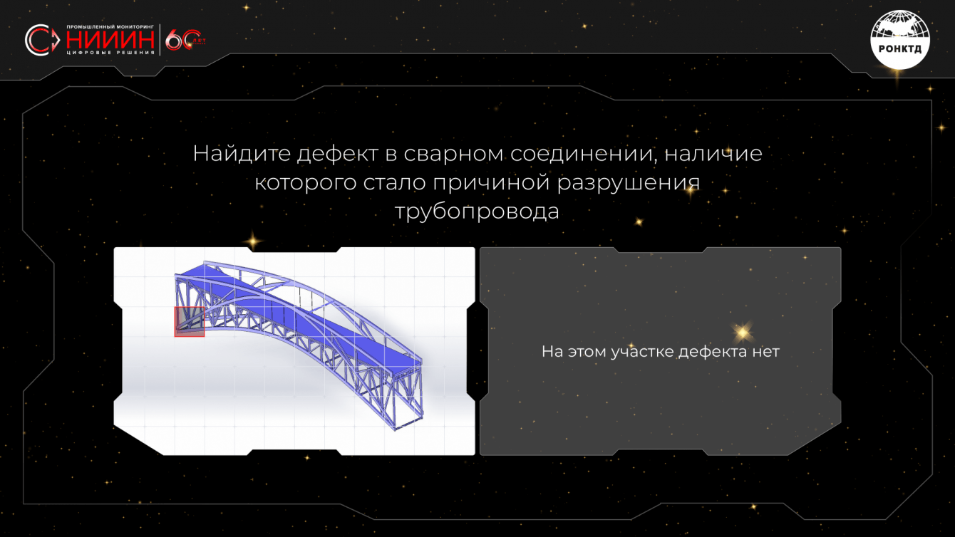 Тщательно проработали дизайн по требованию Заказчика. Смогли максимально точно реализовать алгоритм действий в игре для пользователей. Игра создавалась для пользователей которые рассматривают профессию дефектоскописта. Игра позволяет погрузиться в сферу неразрушающего контроля. Главная цель — поиск производственного брака, выявление дефектов, таких как трещины, коррозийное поражения, протечки воды и других. Дефектоскопист контролирует состояние вверенных ему объектов, диагностирует неполадки и определяет объем мер для их исправления.