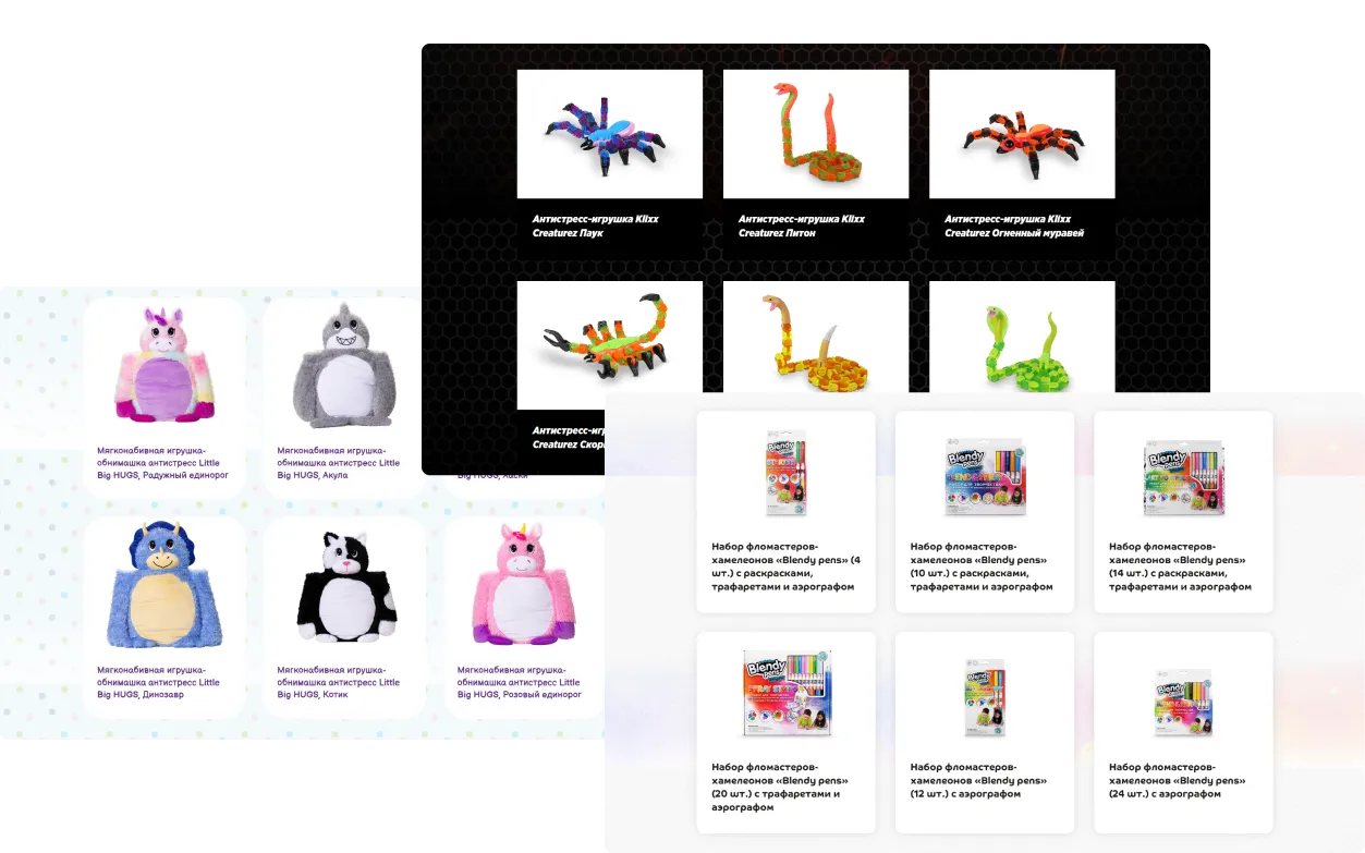 Виртуальная витрина — это удобный способ ознакомиться со всем ассортиментом игрушек, не толкаясь в очередях магазинов. Покупатели могут получить максимум информации о товаре, выбрать необходимую модель игрушки. После этого покупатель может перейти в маркетплейс и купить уже выбранный товар там.